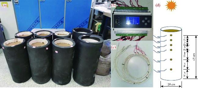 Fig. 1 Apparatus of the evaporation experiment. (a), soil column; (b), multichannel recorder; (c), temperature probe; (d), schematic of the placement of temperature probes. |