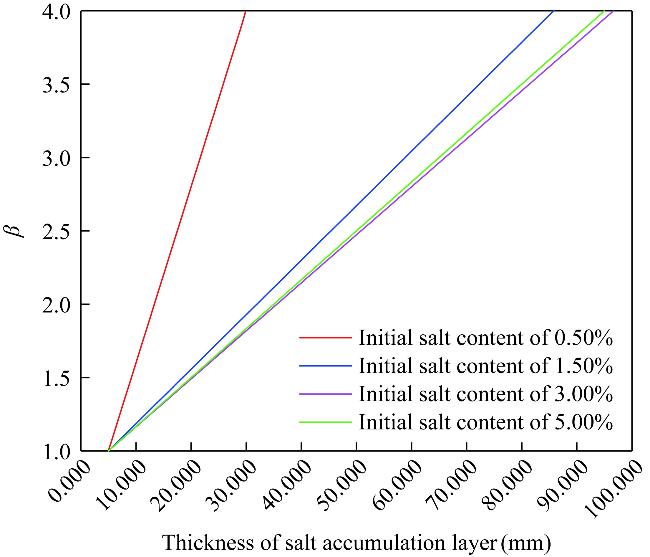 Fig. 10 Relationship between the correction coefficient β of soils and the thickness of the salt accumulation layer under different initial salt contents |