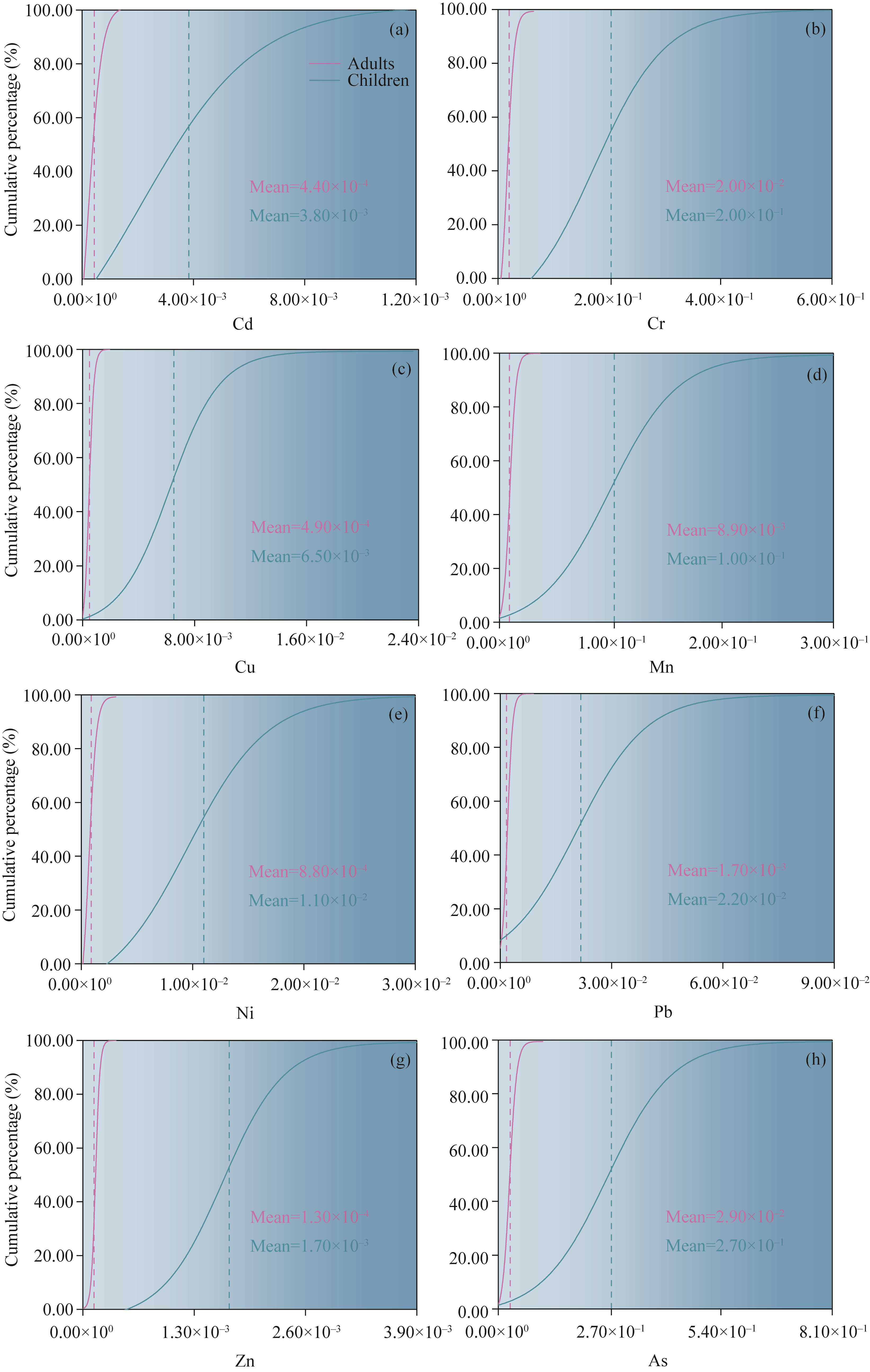 Fig. S1 NCR (non-carcinogenic risk) of eight HMs (heavy metals) based on Monte Carlo simulation. (a), Cd; (b), Cr; (c), Cu; (d), Mn; (e), Ni; (f), Pb; (g), Zn; (h), As. Dashed line indicates the mean value. |