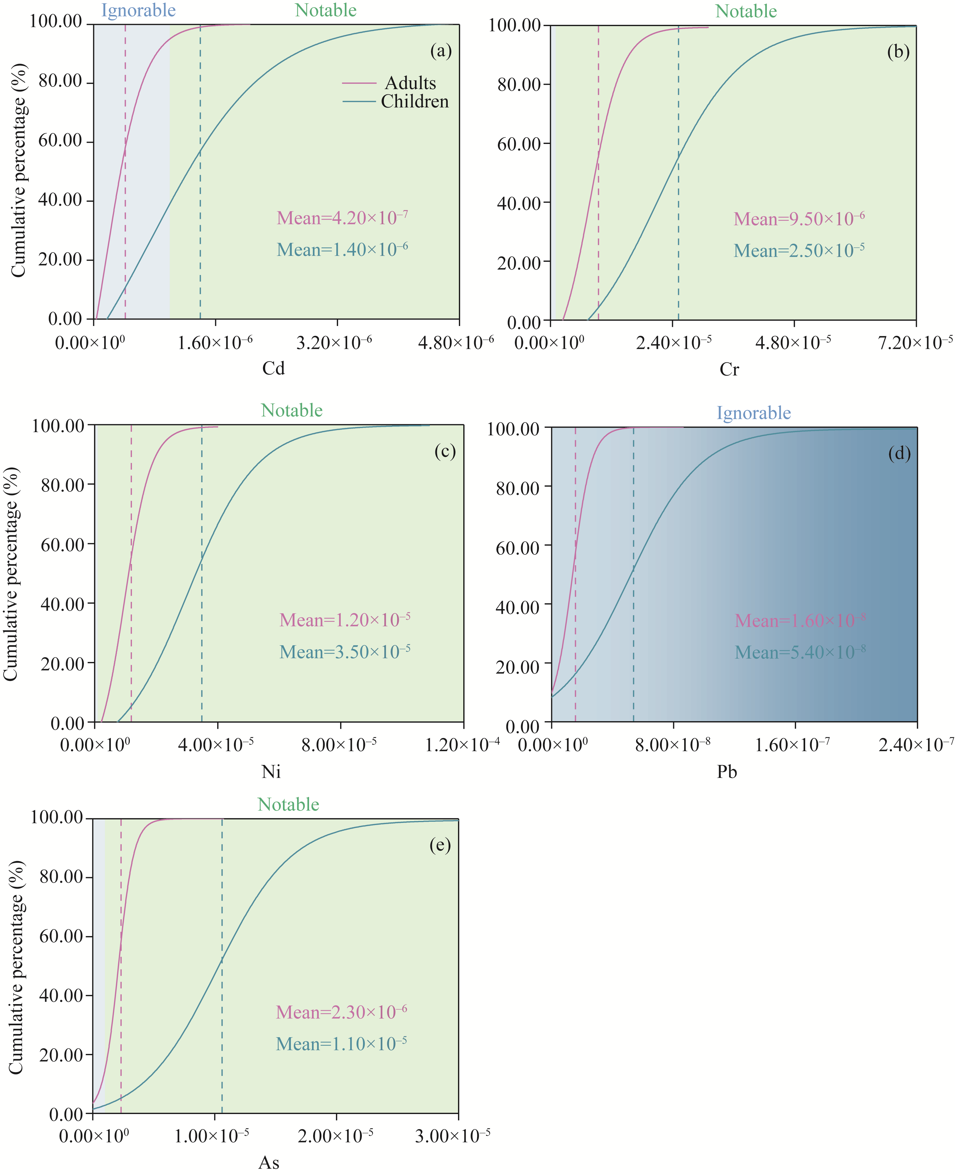Fig. S2 CR (carcinogenic risk) of five HMs based on Monte Carlo simulation. (a), Cd; (b), Cr; (c), Ni; (d), Pb; (e), As. Dashed line indicates the mean value. |
