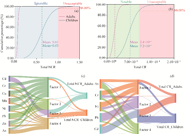 Fig. 5 Results of health risk assessment based on Monte Carlo simulation and PMF model. (a), total NCR (non-carcinogenic risk) result based on Monte Carlo simulation; (b), total CR (carcinogenic risk) result based on Monte Carlo simulation; (c), total NCR result based on PMF model; (d), total CR result based on PMF model. Dashed line in Figure 5a and b indicates the mean value. |