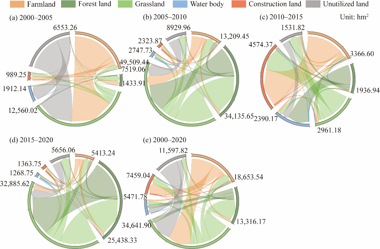 Fig. 4 Chord diagram illustrating land use changes in Gannan Prefecture from 2000 to 2020. (a), 2000-2005; (b), 2005-2010; (c), 2010-2015; (d), 2015-2020; (e), 2000-2020. The number is the sum of variation area of each land use type. |
