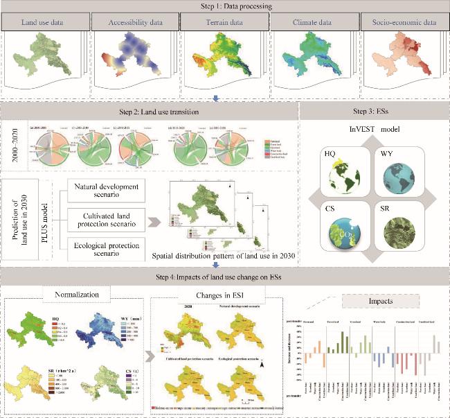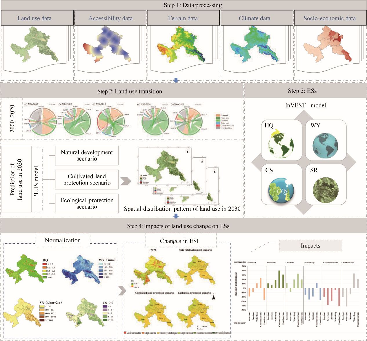 Fig. 2 Framework of this study on the impact of land use change on ecological services (ESs). PLUS, Patch-generating Land-Use Simulation; InVEST, Integrated Valuation of Ecosystem Services and Tradeoffs; HQ, habitat quality; WY, water yield; SR, soil retention; CS, carbon storage; ESI, ecosystem service index. |