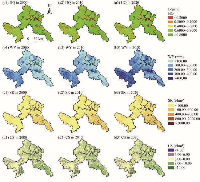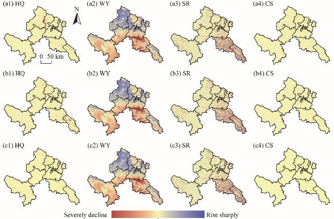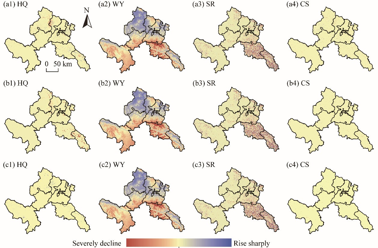 Fig. 6 Spatio-temporal dynamics in ESs in Gannan Prefecture from 2000 to 2020. (a1-a3), HQ; (b1-b3), WY; (c1-c3), SR; (d1-d3), CS. |