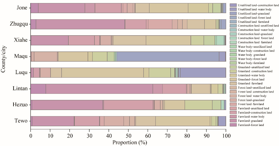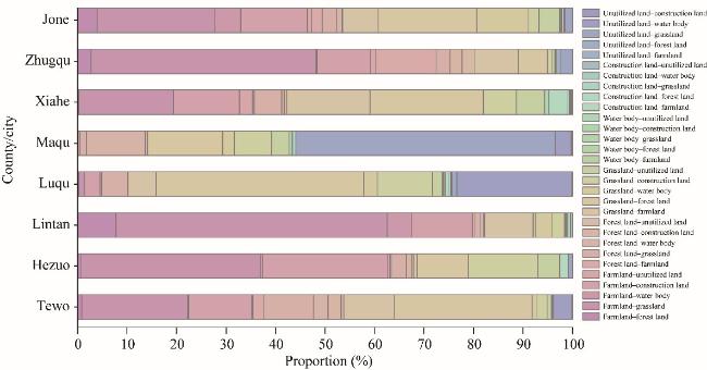 Fig. 8 Proportion of change in different land use types across various counties in Gannan Prefecture from 2000 to 2020 |