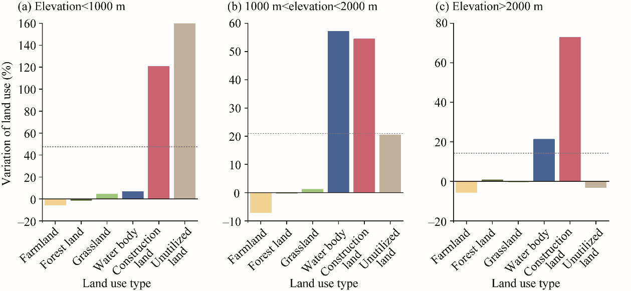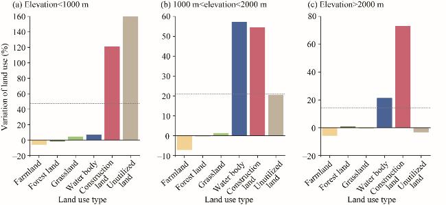 Fig. 10 Variation of land use under different elevations in Gannan Prefecture from 2000 to 2020. (a), elevation<1000 m; (b), 1000 m<elevation<2000 m; (c), elevation>2000 m. |