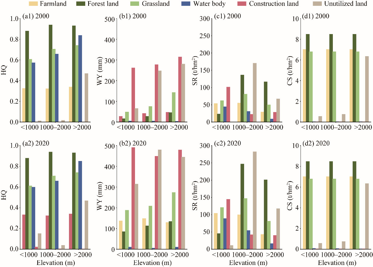 Fig. 11 ESs under different land use types and elevations in Gannan Prefecture in 2000 and 2020. (a1 and a2), HQ; (b1 and b2), WY; (c1 and c2), SR; (d1 and d2), CS. |