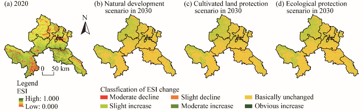 Fig. 12 Spatio-temporal pattern of ESI in 2020 (a) and ESI change under three predictive scenarios in 2030 compared with 2020 (b, c, and d) in Gannan Prefecture |