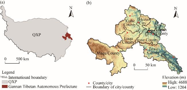 Fig. 1 Geographic location (a) and overview (b) of Gannan Tibetan Autonomous Prefecture, Gansu Province, China. The Gannan Tibetan Autonomous Prefecture is abbreviated as Gannan Prefecture in hereinafter figures. QXP, Qinghai-Xizang Plateau. |