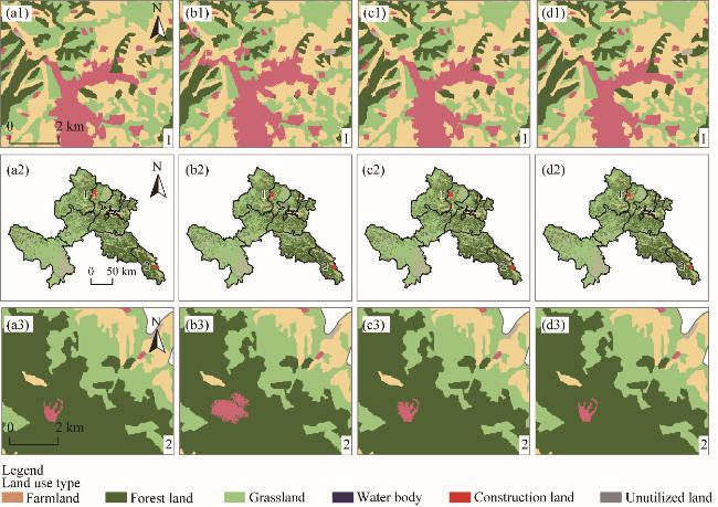 Fig. 5 Comparison of 2020 baseline land use with three predictive scenarios for 2030 in Gannan Prefecture. (a1-a3), 2020; (b1-b3), natural development scenario in 2030; (c1-c3), cultivated land protection scenario in 2030; (d1-d3), ecological protection scenario in 2030. |