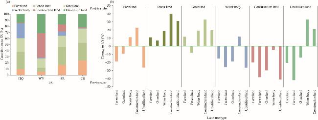 Fig. 9 Contribution percentage of distinct land use types (a) and impact of land use changes (b) on ESs in Gannan Prefecture from 2000 to 2020 |