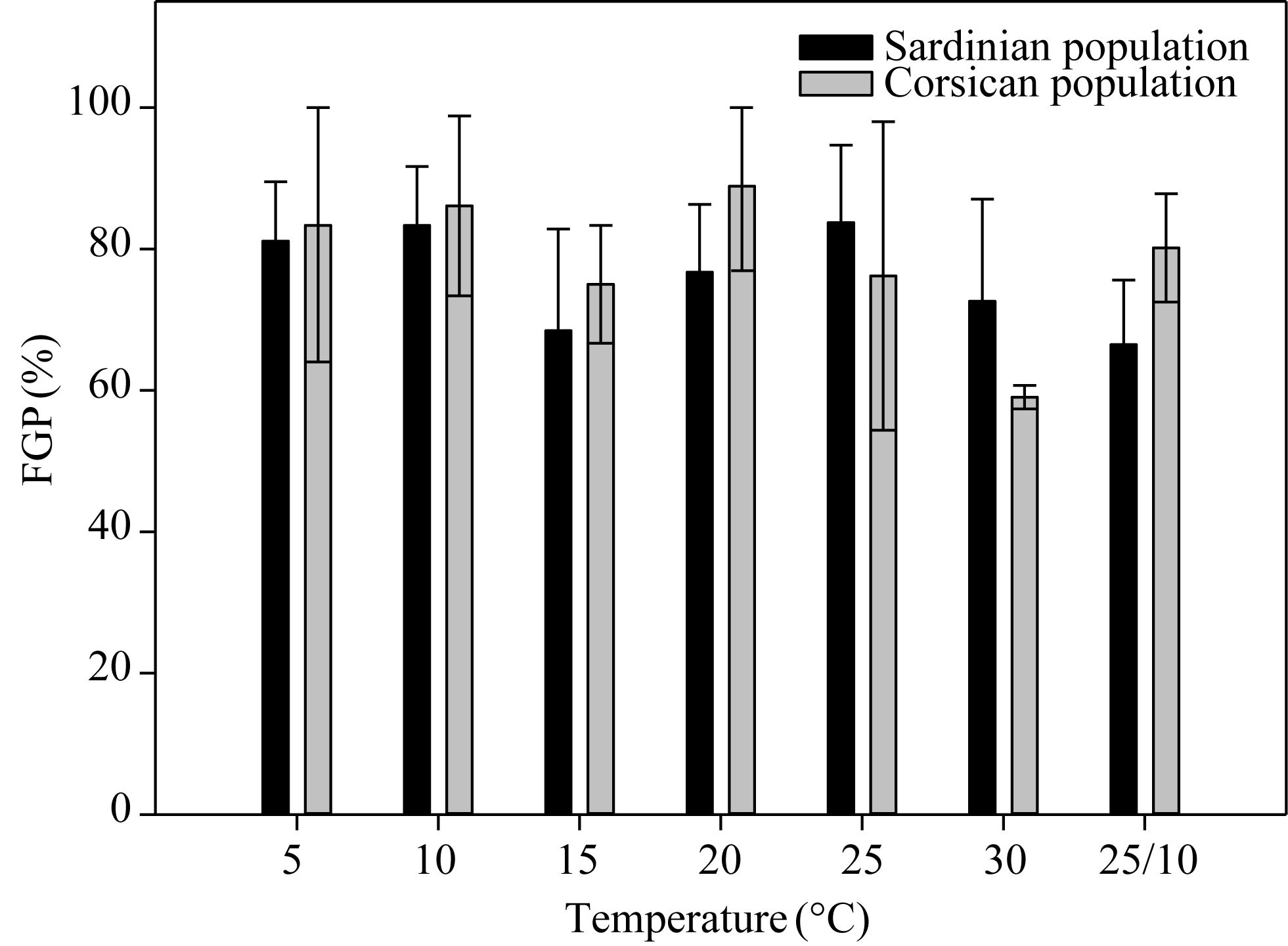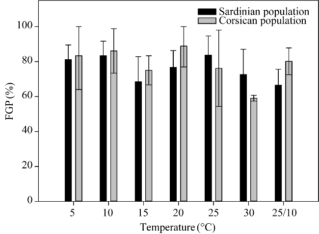 Fig. 1 Final germination percentage (FGP) of Limonium strictissimum (Salzm.) Arrigoni seeds from different populations incubated at constant (5°C, 10°C, 15°C, 20°C, 25°C, and 30°C) and alternating (25°C/10°C) temperatures. Bars are standard errors. |