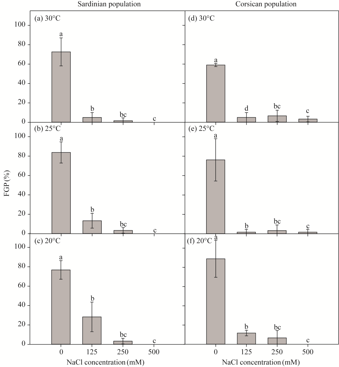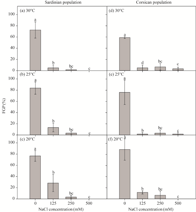 Fig. 2 Effect of different concentrations of NaCl (0, 125, 250, and 500 mM) on FGP of L. strictissimum incubated at constant temperatures (20°C, 25°C, and 30°C) for different populations. Different lowercase letters indicate significant differences among different NaCl concentrations at P<0.050 level. (a-c), 30°C, 25°C, and 20°C in the Sardinian population; (d-f), 30°C, 25°C, and 20°C in the Corsican population. Bars are standard errors. |