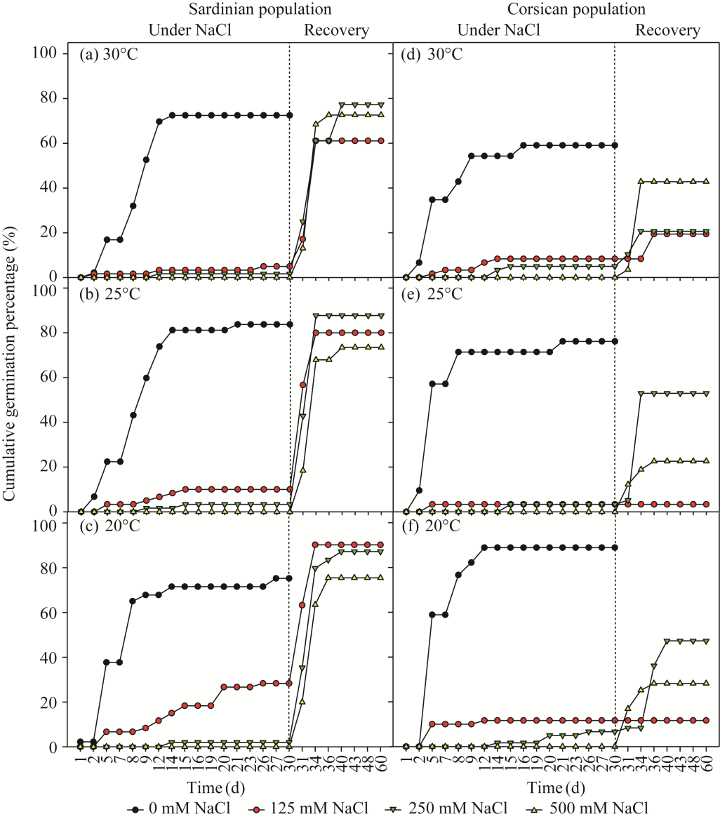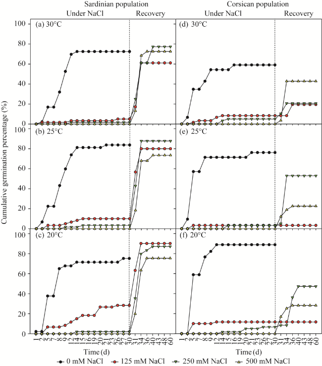 Fig. 3 Cumulative germination percentage of L. strictissimum seeds under different temperatures (20°C, 25°C, and 30°C) and salt stresses (0, 125, 250, and 500 mM NaCl) for different populations. (a-c), 30°C, 25°C, and 20°C in the Sardinian population; (d-f), 30°C, 25°C, and 20°C in the Corsican population. The vertical line indicates the beginning of the recovery phase. |