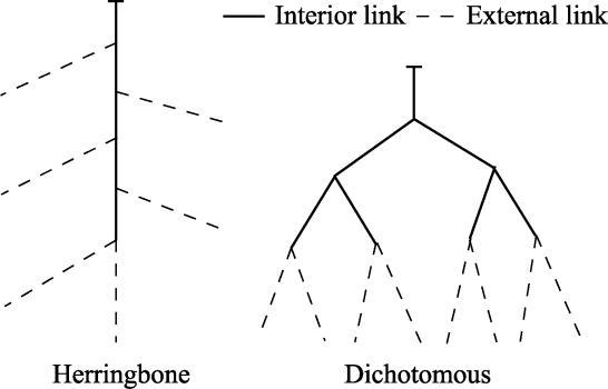 Fig. 1 Two extreme root branching patterns of herringbone and dichotomous (Fitter, 1987) |