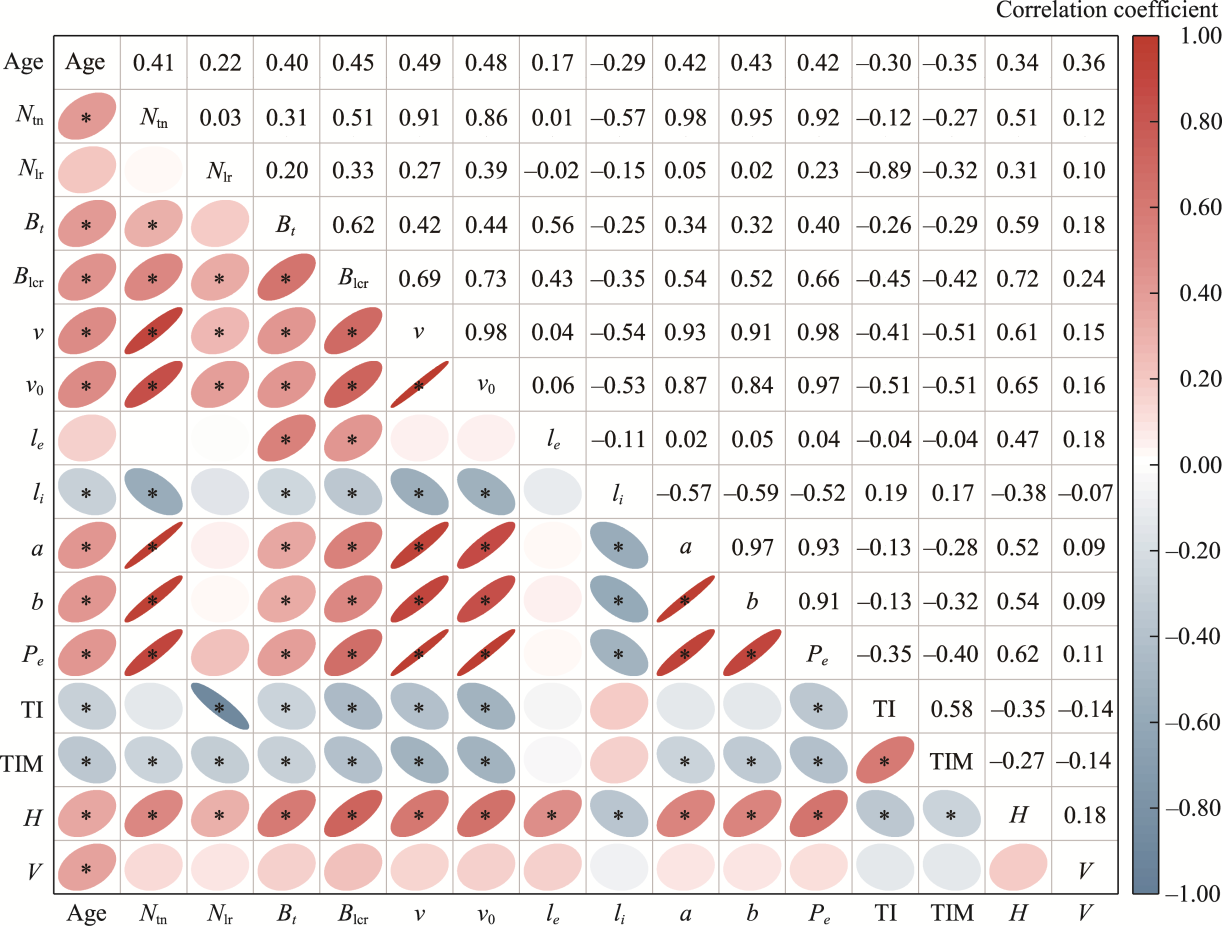 Fig. 5 Correlation analysis between root distribution and topological parameters. * indicates a significant correlation at the P<0.05 level. |