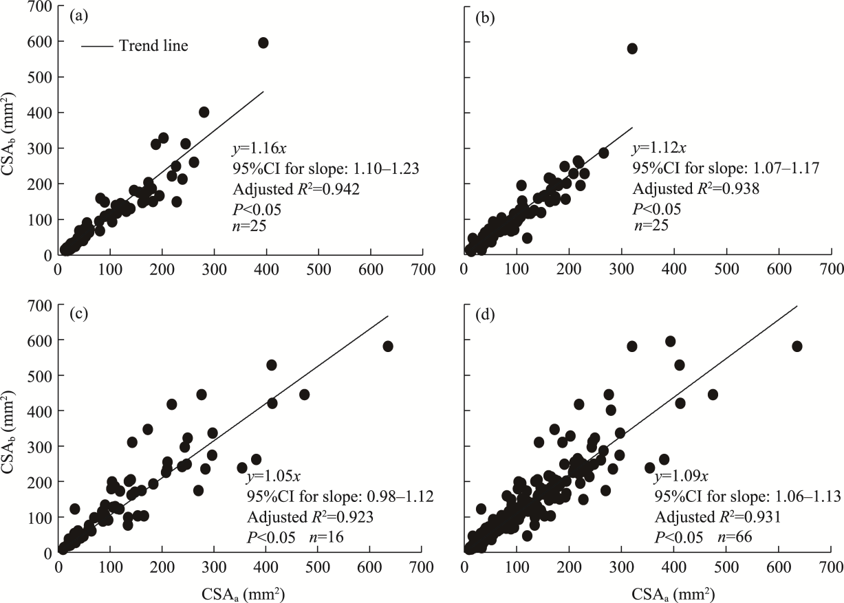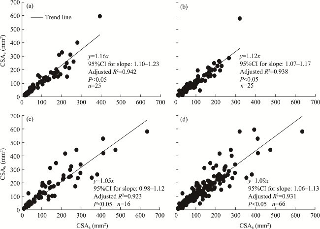 Fig. 7 Linear regression (through the origin) of cross-sectional area before branching (CSAb) against cross- sectional area after branching (CSAa) for age classes of 0-19 a (a), 20-29 a (b), and ≥30 a (c), and the entire age sequence (d). 95%CI represents the 95% confidence interval. |