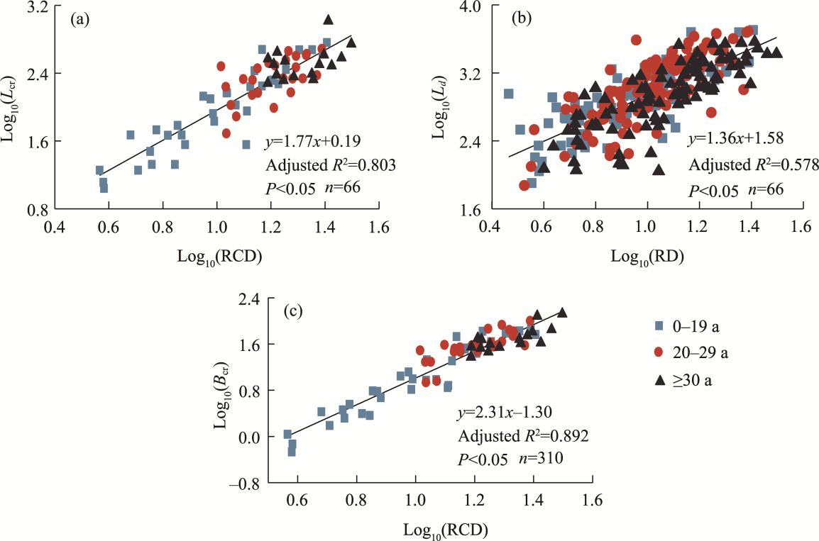 Fig. 8 Scaling relationships in the root systems of R. soongorica. (a), relationship between log10-transformed root collar diameter (RCD) and total coarse root length (Lcr); (b), relationship between log10-transformed root diameter (RD) and total distal length (Ld); (c), relationship between log10-transformed RCD and total coarse root biomass (Bcr). |