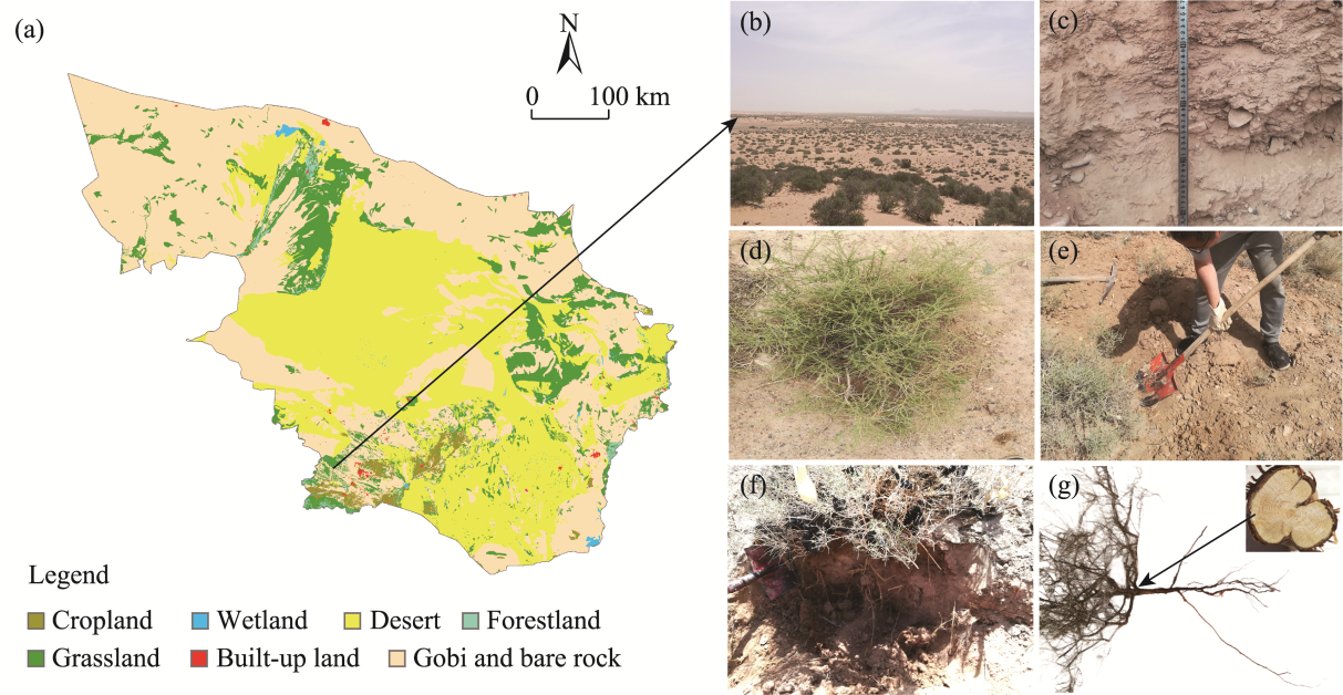 Fig. 2 Overview of the study area (a) and photos showing the landscape of the sampling plot (b), soil profile (c), dominant shrub species Reaumuria soongorica (d), field sampling of R. soongorica (e), root profile of R. soongorica (f), and ring and root system architecture of R. soongorica (g) |