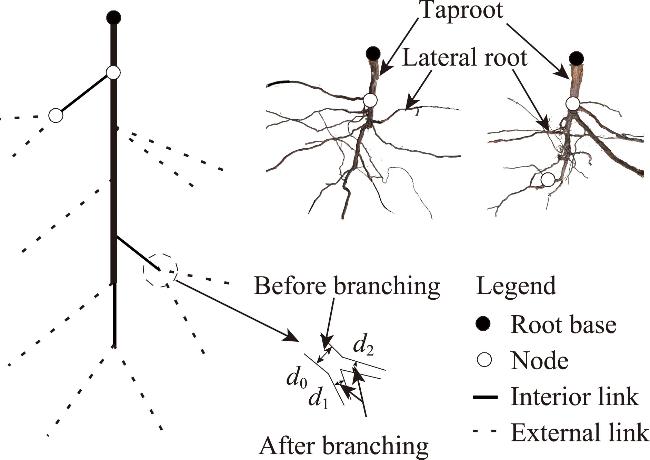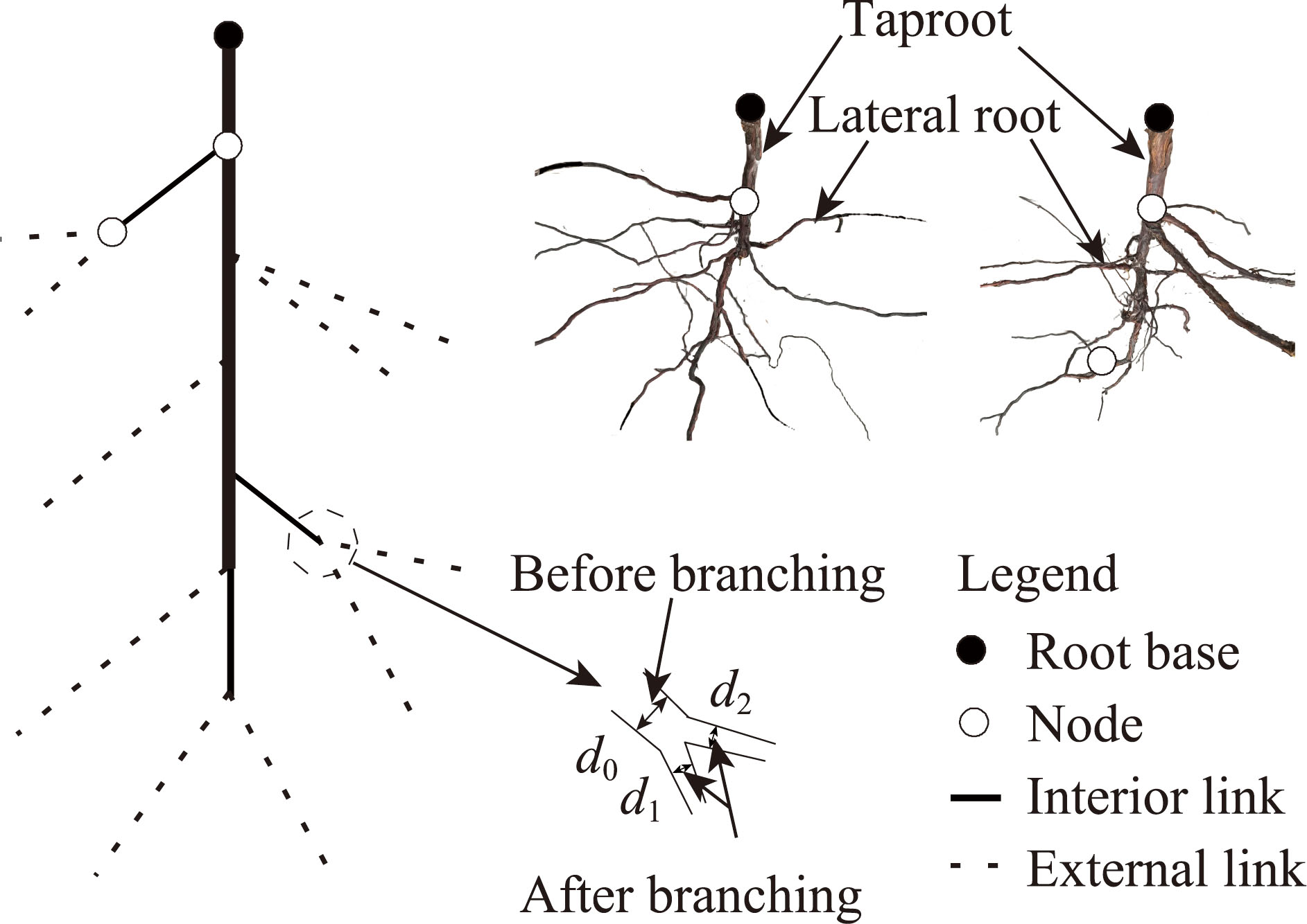 Fig. 3 Root branching patterns of R. soongorica. d0 is the root diameter before root branching; d1 and d2 are the root diameters after branching. |