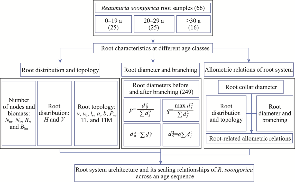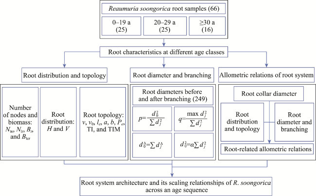 Fig. 4 Workflow of the data analysis in the present study. Ntn represents the number of taproot nodes per shrub; Nlr represents the number of lateral roots per taproot node; Bt represents the biomass of taproot per shrub; Blcr represents the biomass of lateral coarse roots per shrub; H represents the root maximal horizontal extension; V represents the root maximal vertical extension; v represents the total number of links; v0 represents the number of external links; le represents the mean external link length; li represents the mean interior link length; a represents the altitude, which is the longest path (a path with the most links) from the root base to external links; b represents the topological depth; Pe represents the external path length, which is the sum of all path lengths from external links to the root base; p represents the proportionality factor; dj represents the root diameter after branching; q represents the allocation factor; Δ represents the diameter exponent; α represents the regression slope; TI represents the topological index; TIM represents the modified topological index. Values in parentheses represent the sample sizes. |