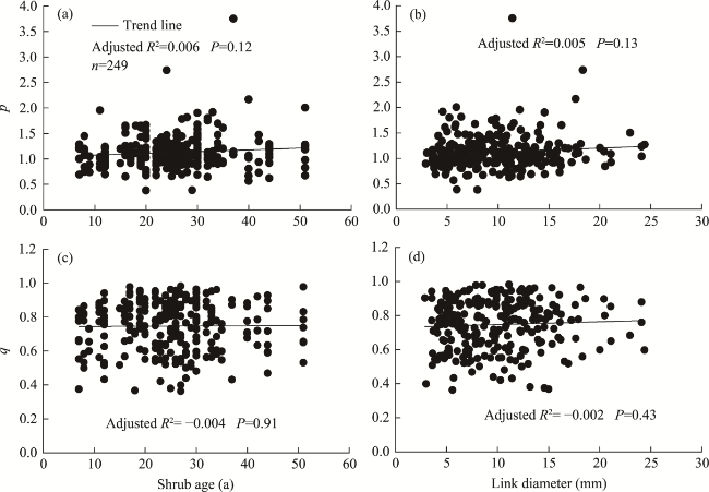 Fig. 6 Regression of root branching parameters (p and q) against shrub age (a and c) and link diameter (b and d) |