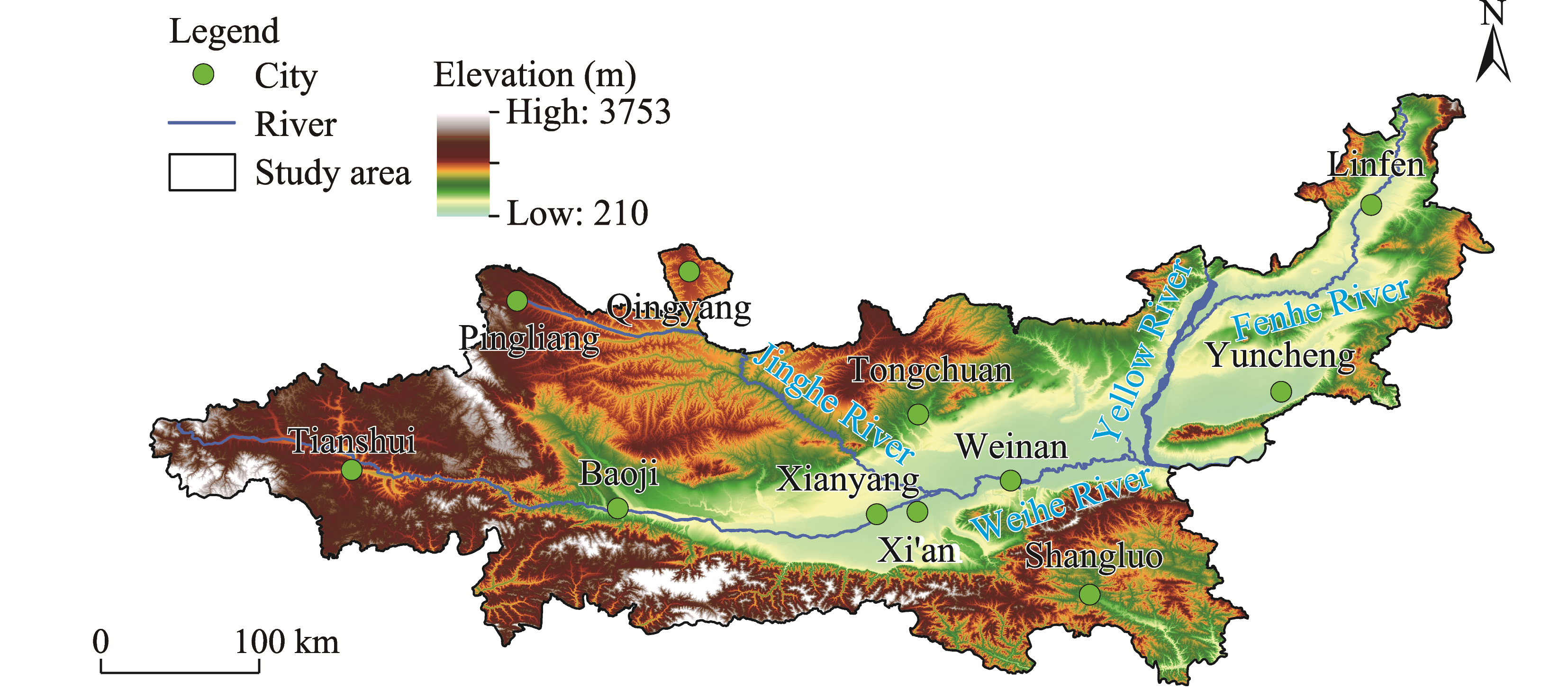 Fig. 1 Overview of the Guanzhong Plain Urban Agglomeration (GPUA) based on the digital elevation model (DEM) |