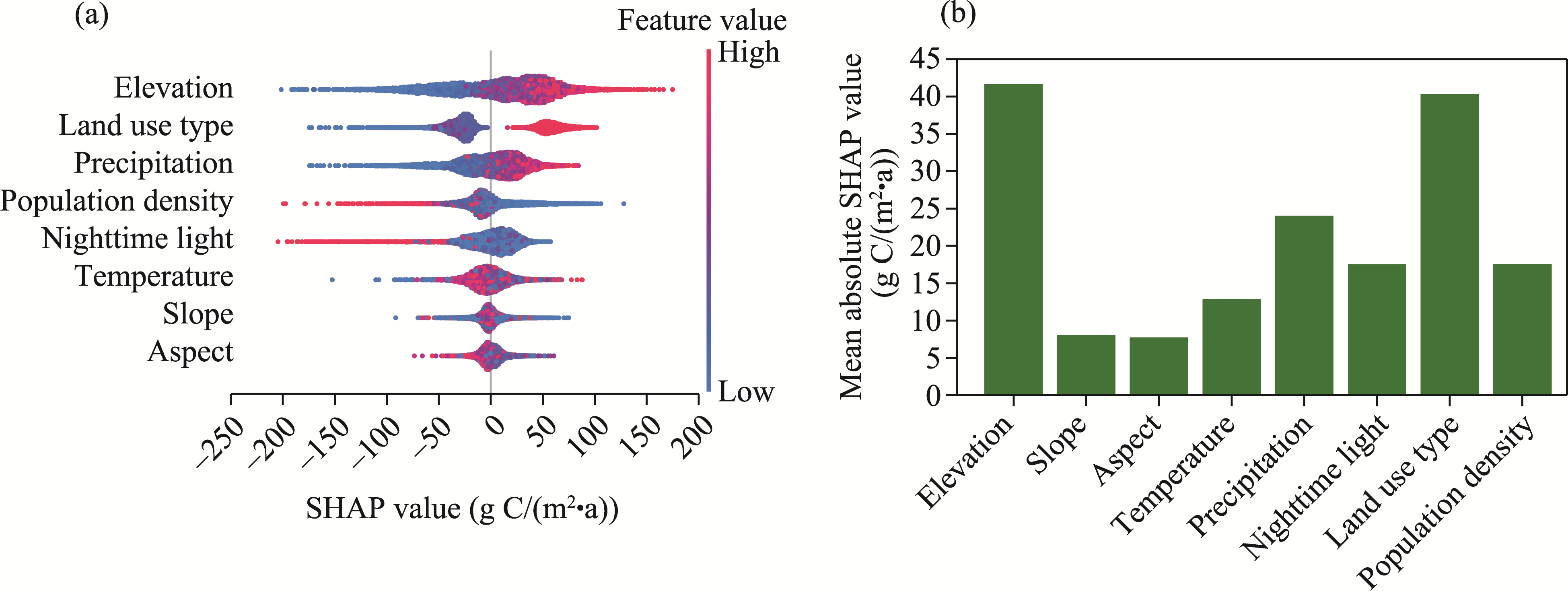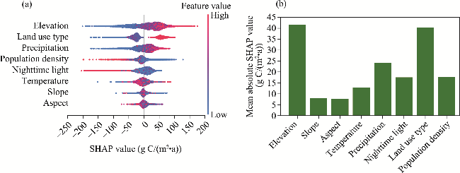 Fig. 10 SHAP value impact plot of the XGBoost model (a) and bar plot showing the mean absolute SHAP values of each driving factor of NPP (b) |