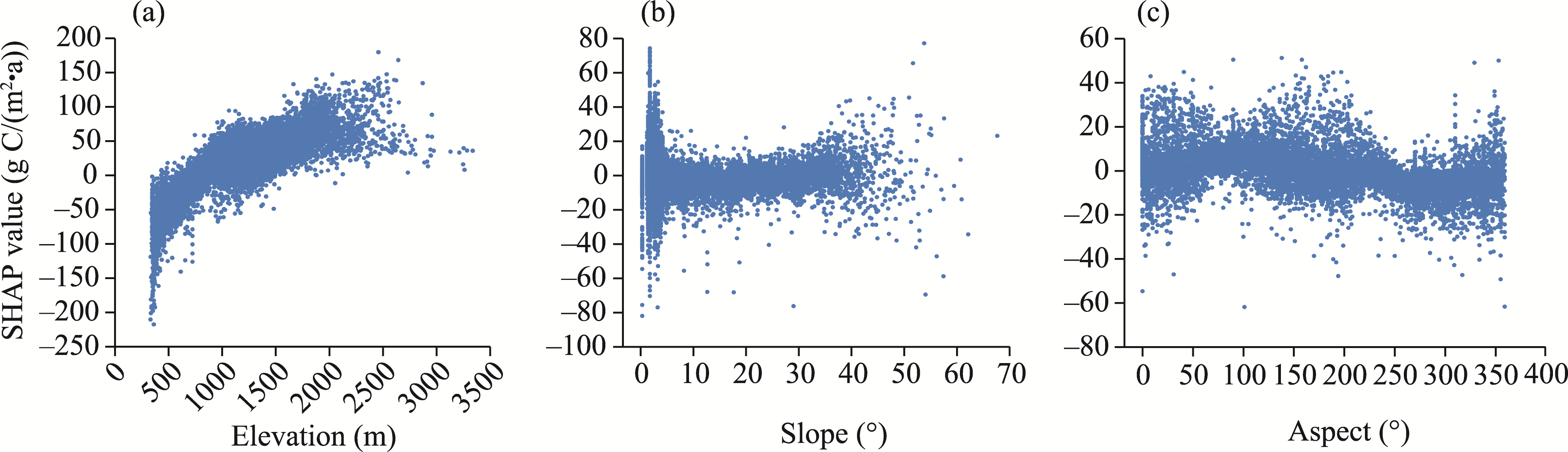 Fig. 11 SHAP dependence plots of elevation (a), slope (b), and aspect (c) |