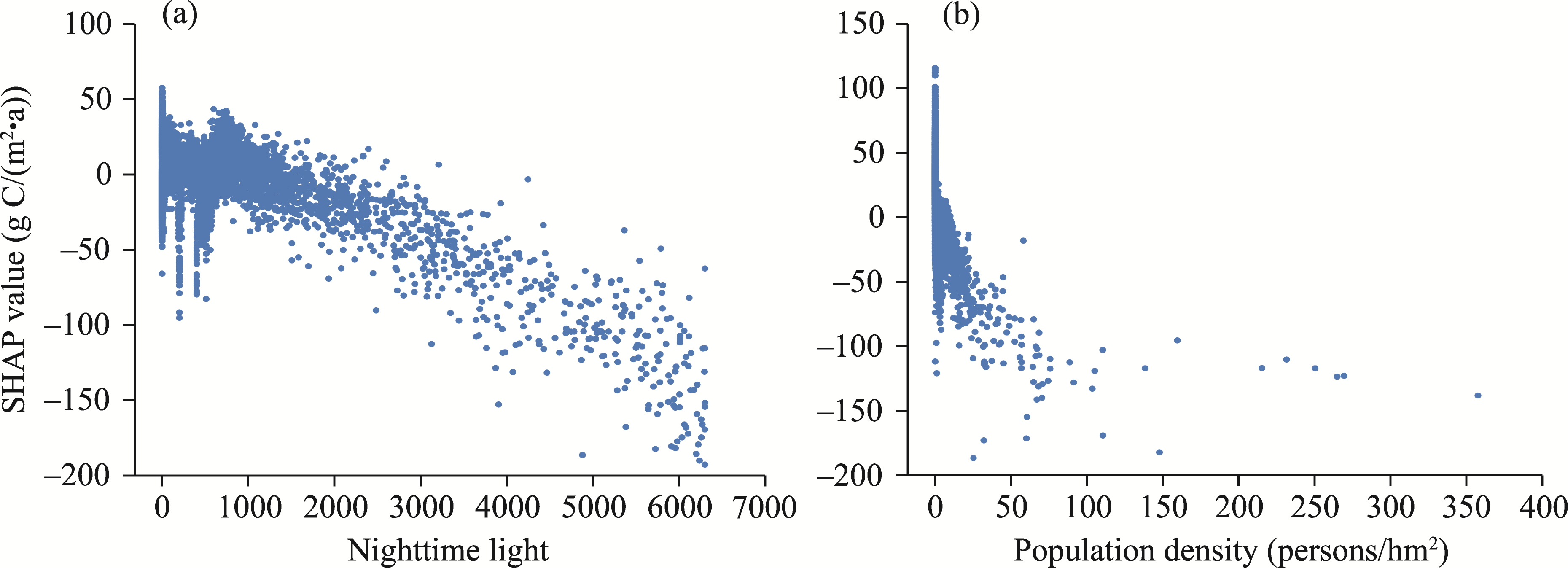 Fig. 13 SHAP dependence plots of nighttime light (a) and population density (b) |