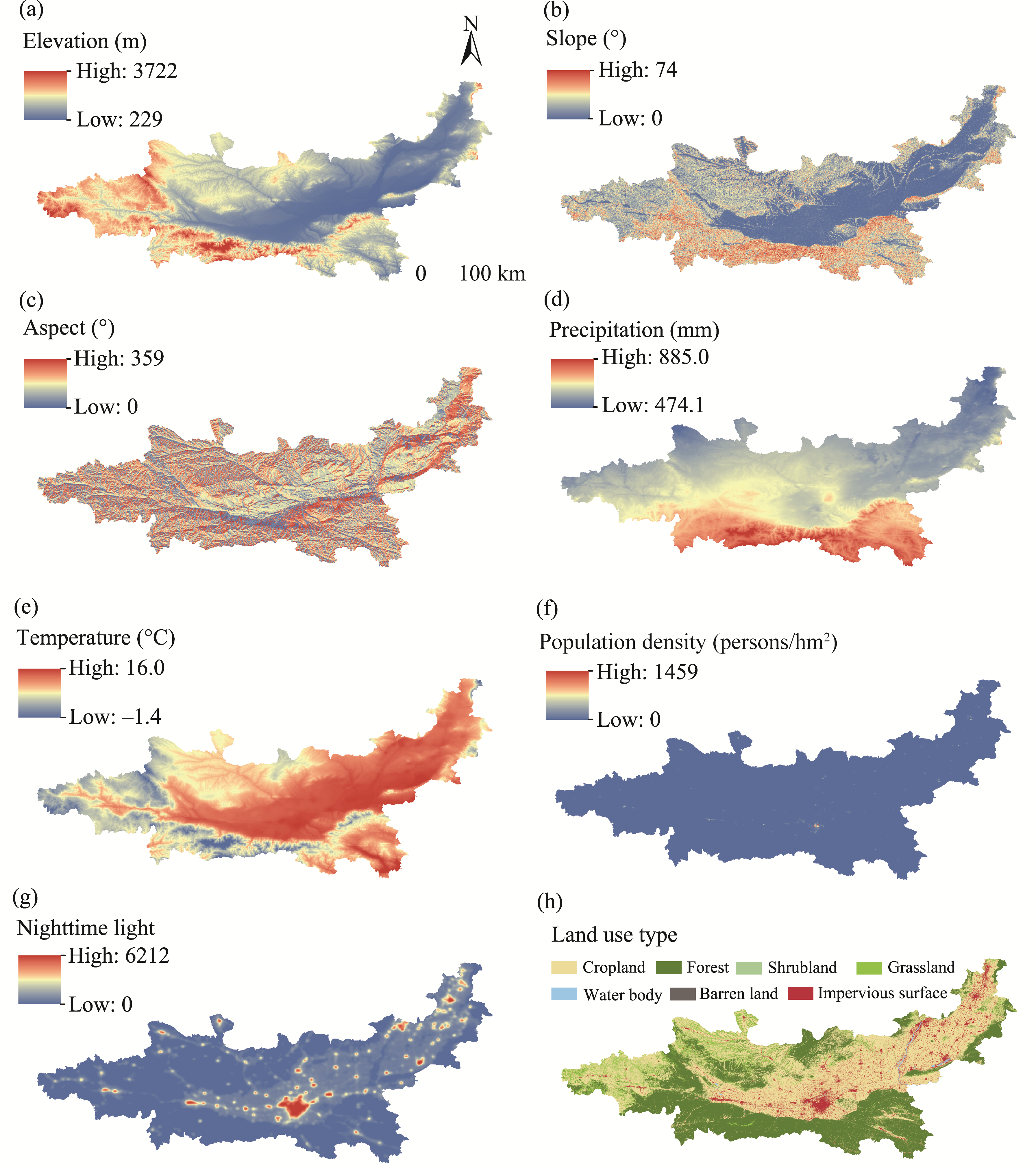Fig. 2 Spatial distribution of driving factors affecting net primary productivity (NPP) changes during 2001-2020. (a), elevation; (b), slope; (c), aspect; (d), precipitation; (e), temperature; (f), population density; (g), nighttime light; (h), land use type. |