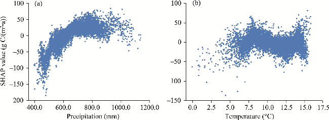Fig. 12 SHAP dependence plots of precipitation (a) and temperature (b) |