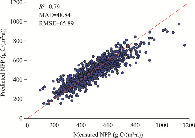 Fig. 4 Accuracy evaluation of predicted NPP in the XGBoost model. MAE, mean absolute error; RMSE, root mean square error. |