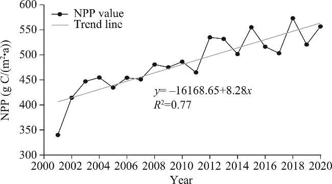 Fig. 5 Temporal variation in average NPP in the GPUA from 2001 to 2020 |