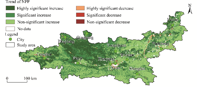 Fig. 7 Spatial variation in the trend of annual NPP in the GPUA during 2001-2020 |