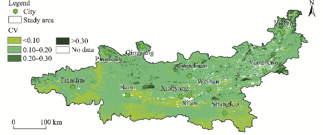 Fig. 8 Spatial variation in coefficient of variation (CV) in the GPUA during 2001-2020 |