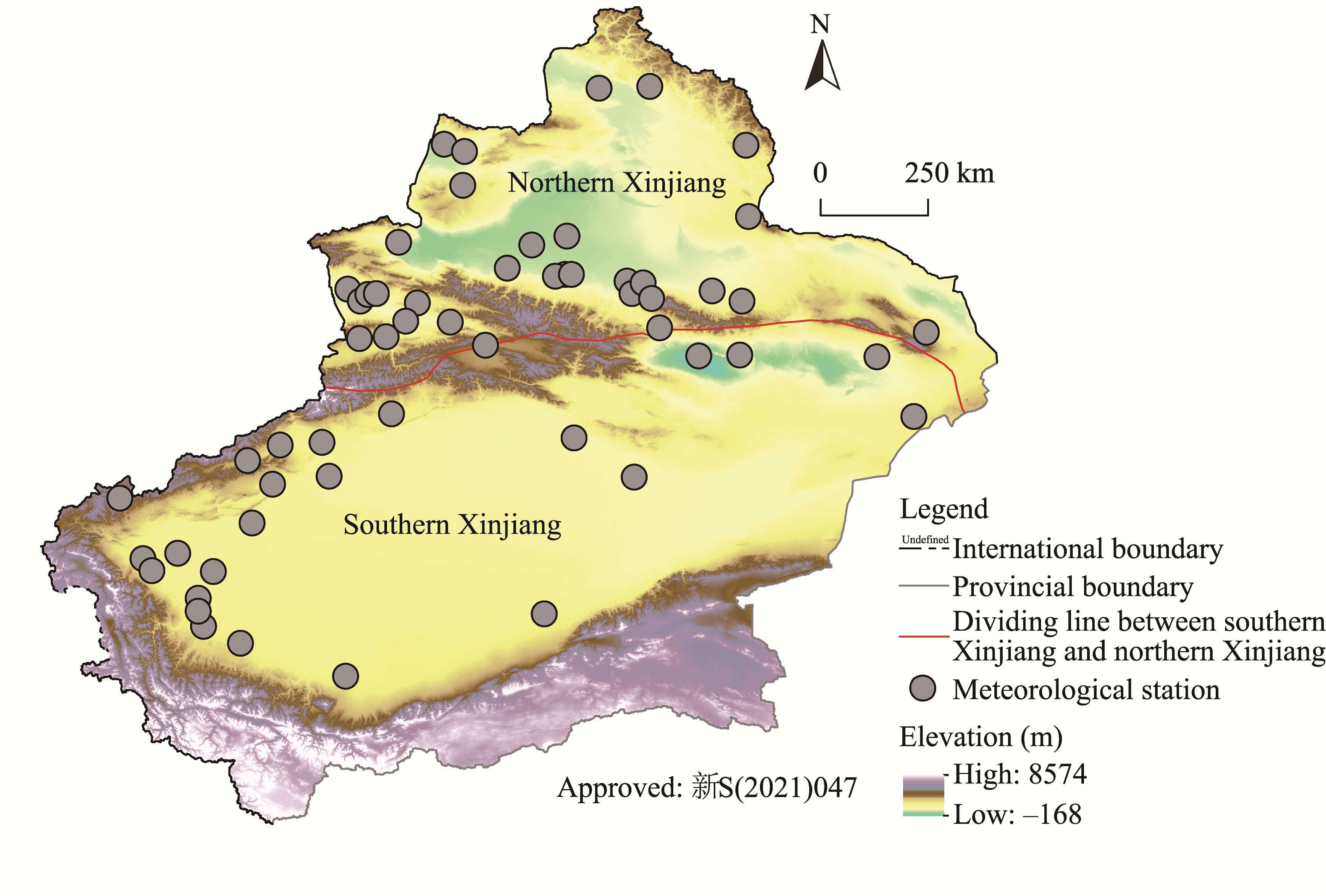 Fig. 1 Location of 56 meteorological stations adopted by this study in Xinjiang. Noted that the figure is based on the standard map (No. 新S(2021)047) of the Xinjiang Uygur Autonomous Region Platform for Common Geospatial Information Services (https://xinjiang.tianditu.gov.cn/main/bzdt.html) marked by the Department of Natural Resources of Xinjiang Uygur Autonomous Region, and the base map has not been modified. |