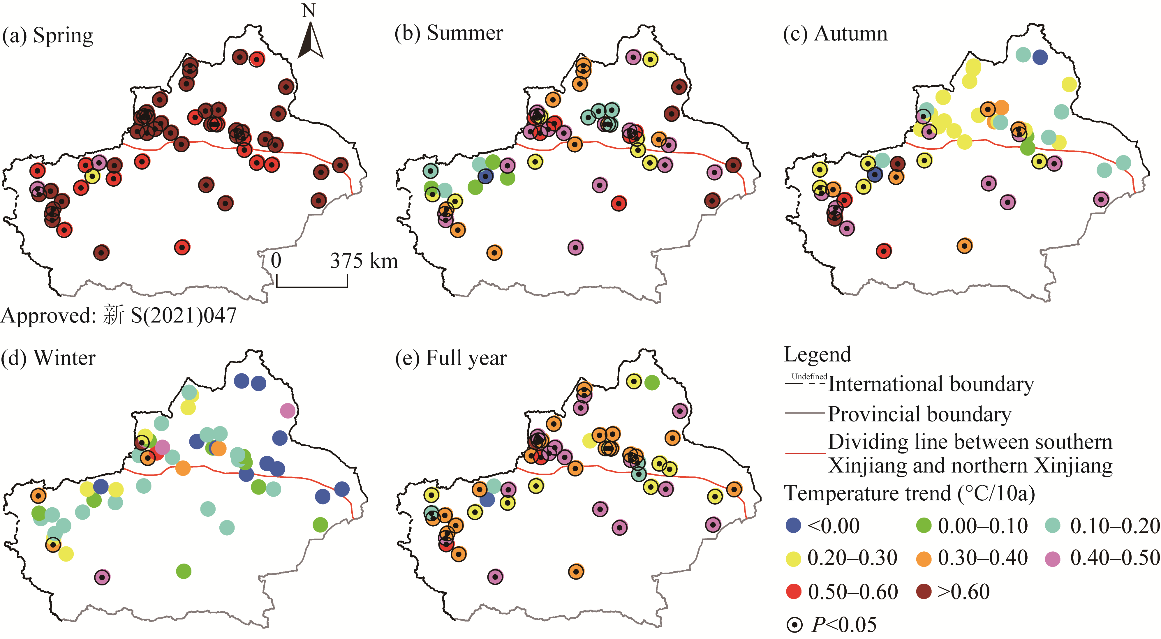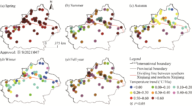 Fig. 2 Spatial distribution of temperature trends in Xinjiang at seasonal (a-d) and annual (e) scales from 1980 to 2020 |