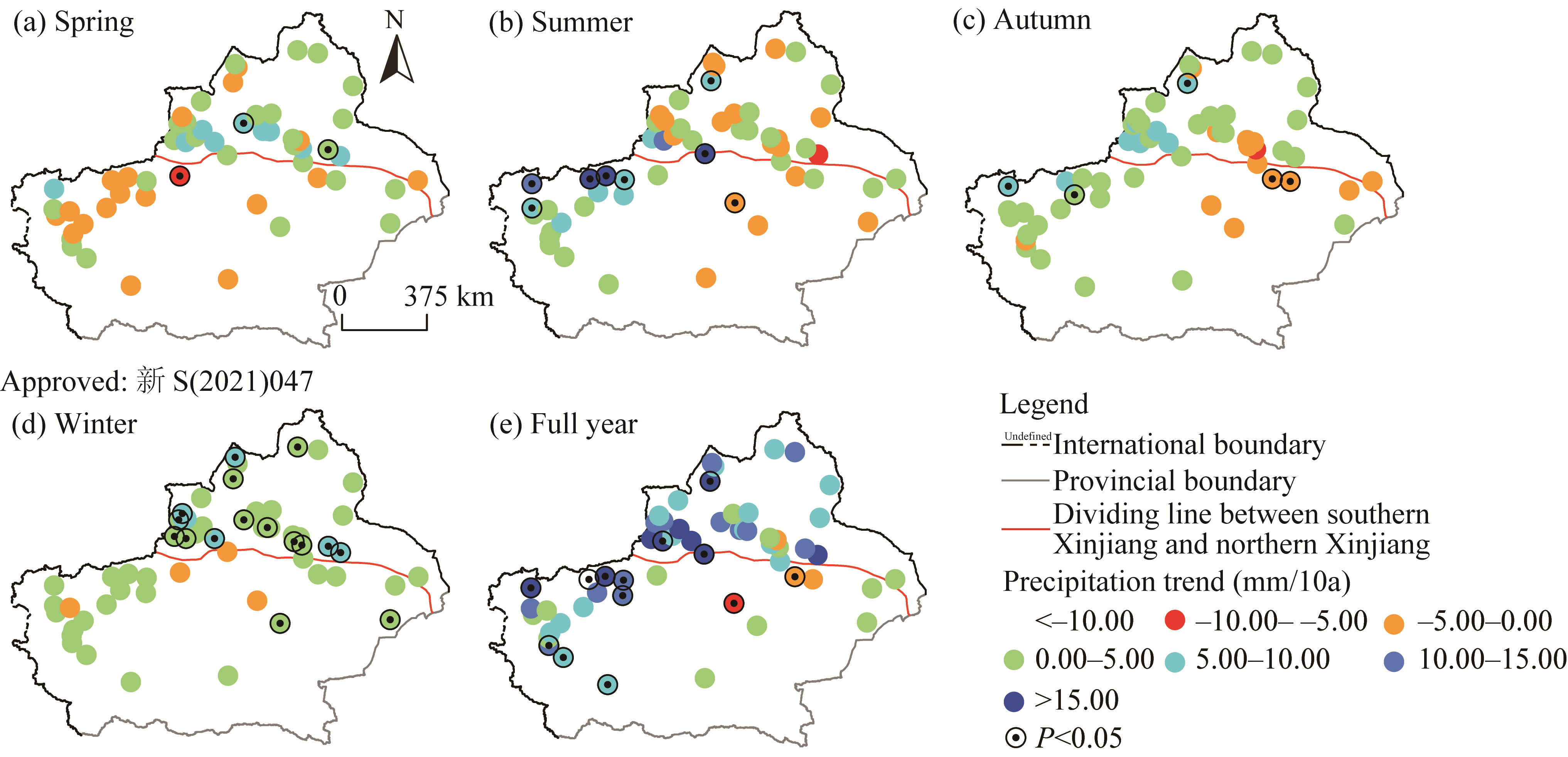 Fig. 3 Spatial distribution of precipitation trends in Xinjiang at seasonal (a-d) and annual (e) scales from 1980 to 2020 |