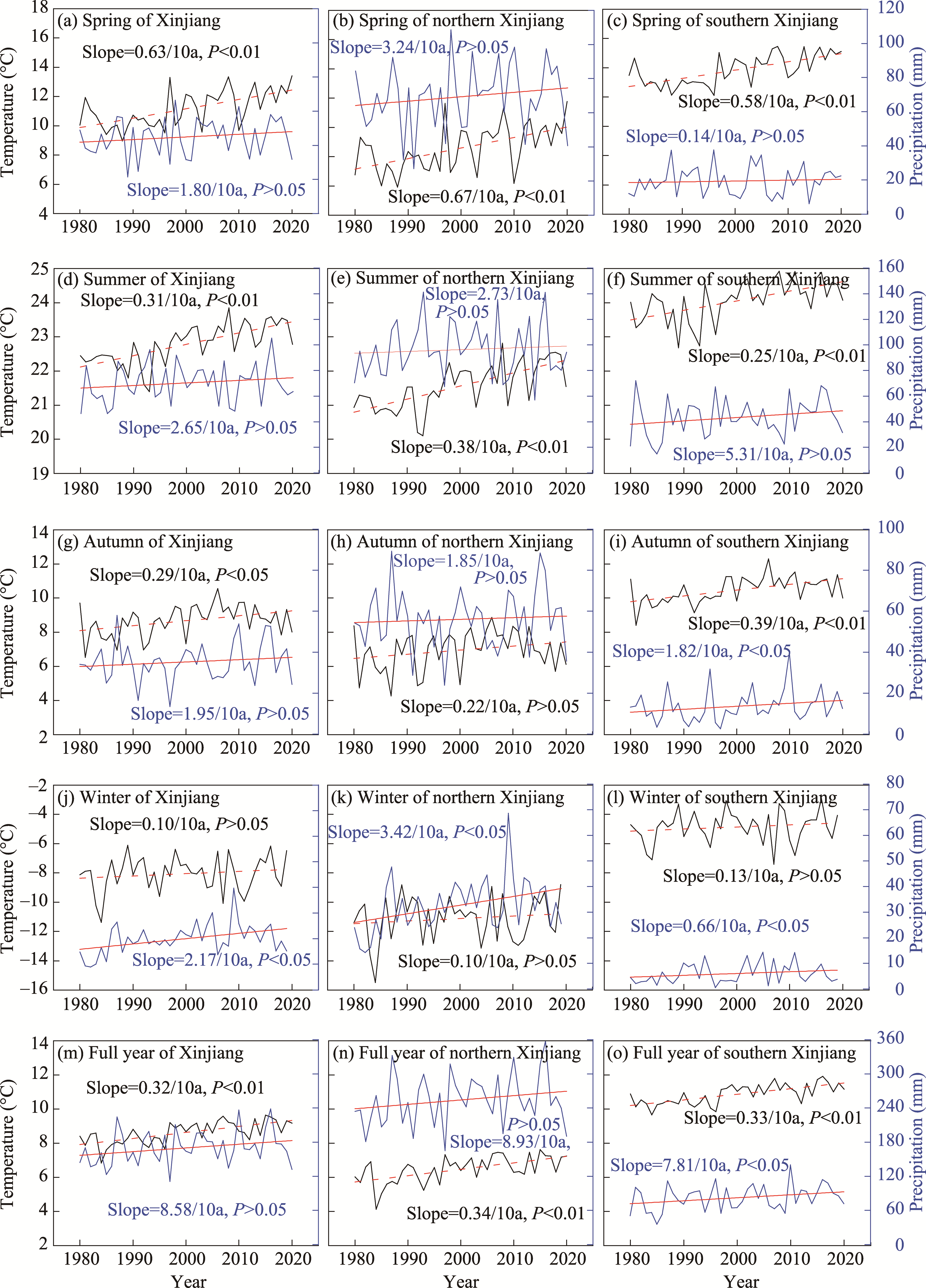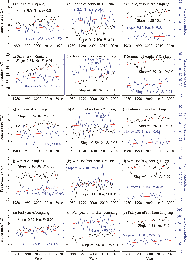 Fig. 4 Change trends of temperature and precipitation in Xinjiang (a, d, g, j, and m), northern Xinjiang (b, e, h, k, and n), and southern Xinjiang (c, f, i, l, and o) at seasonal and annual scales from 1980 to 2020 |