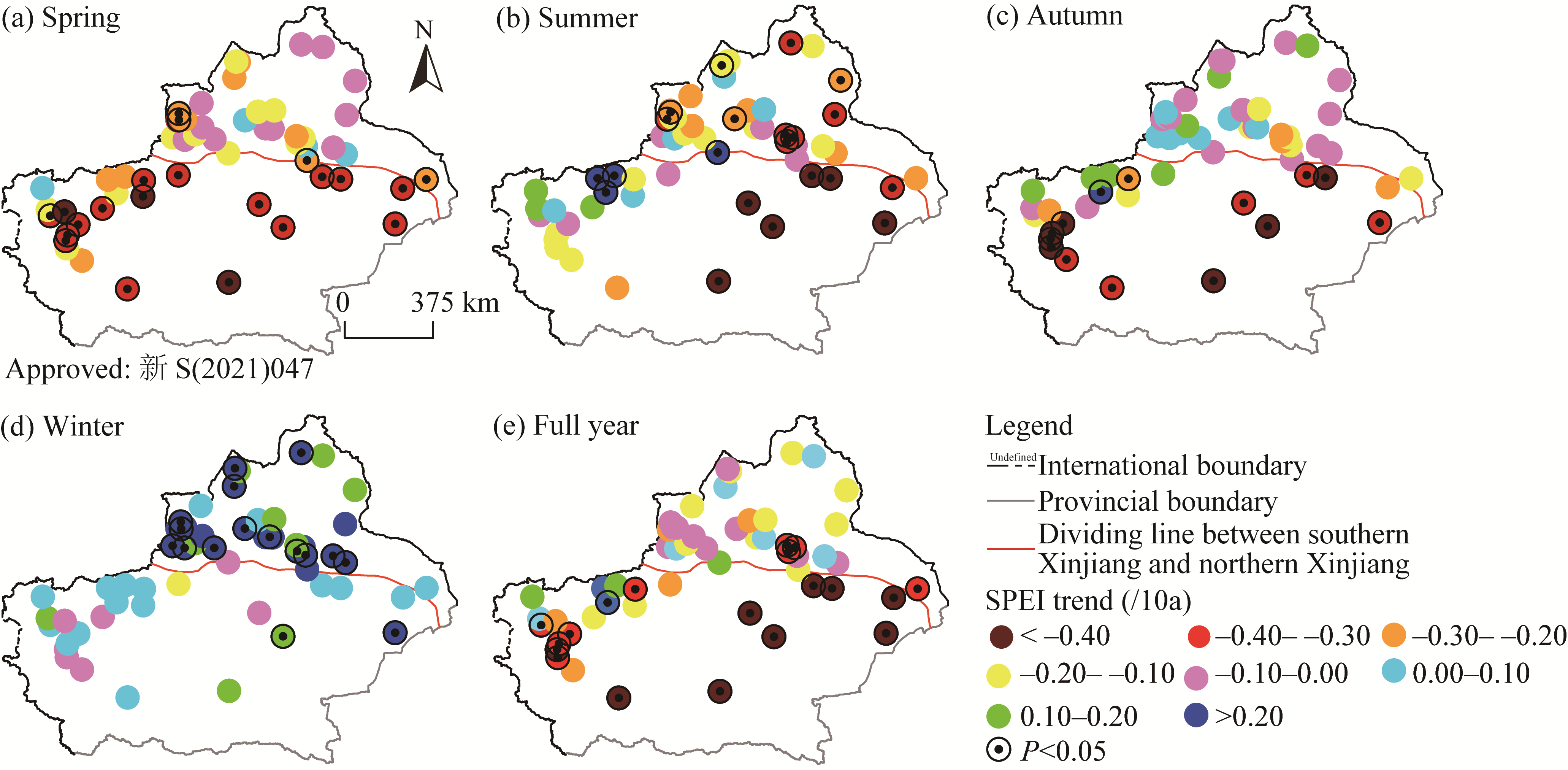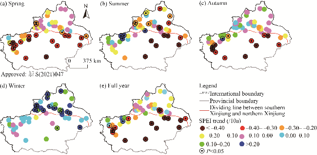 Fig. 5 Spatial distribution of drought trends in Xinjiang at seasonal (a-d) and annual (d) scales at from 1980 to 2020 |