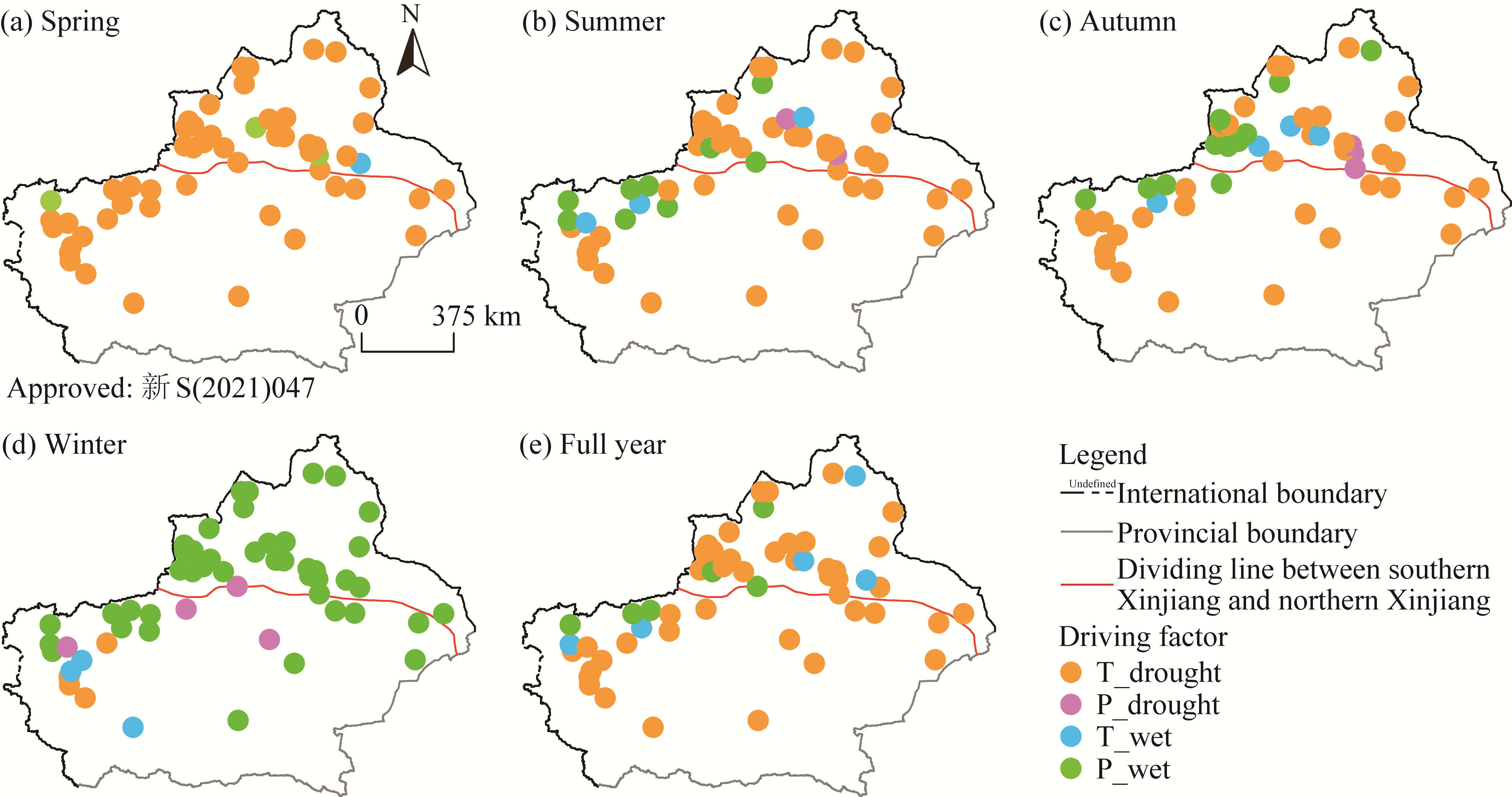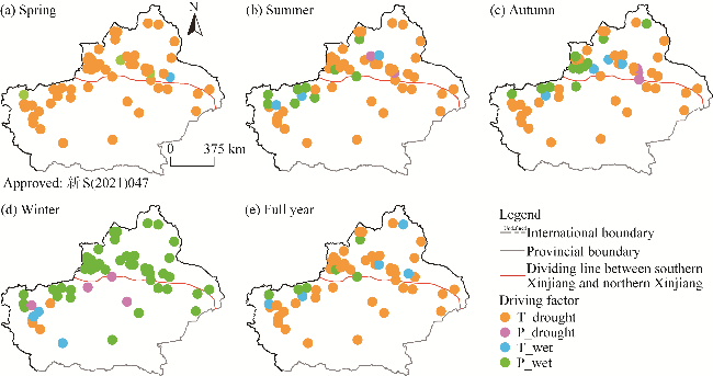 Fig. 8 Spatial distribution of dominant factors influencing the drought and wetting trends in Xinjiang at seasonal (a-d) and annual (e) scales from 1980 to 2020. T_drought, temperature-dominated drought trend; P_drought, precipitation-dominated drought trend; P_wet, precipitation-dominated wetting trend; T_wet, temperature-dominated wetting trend. |