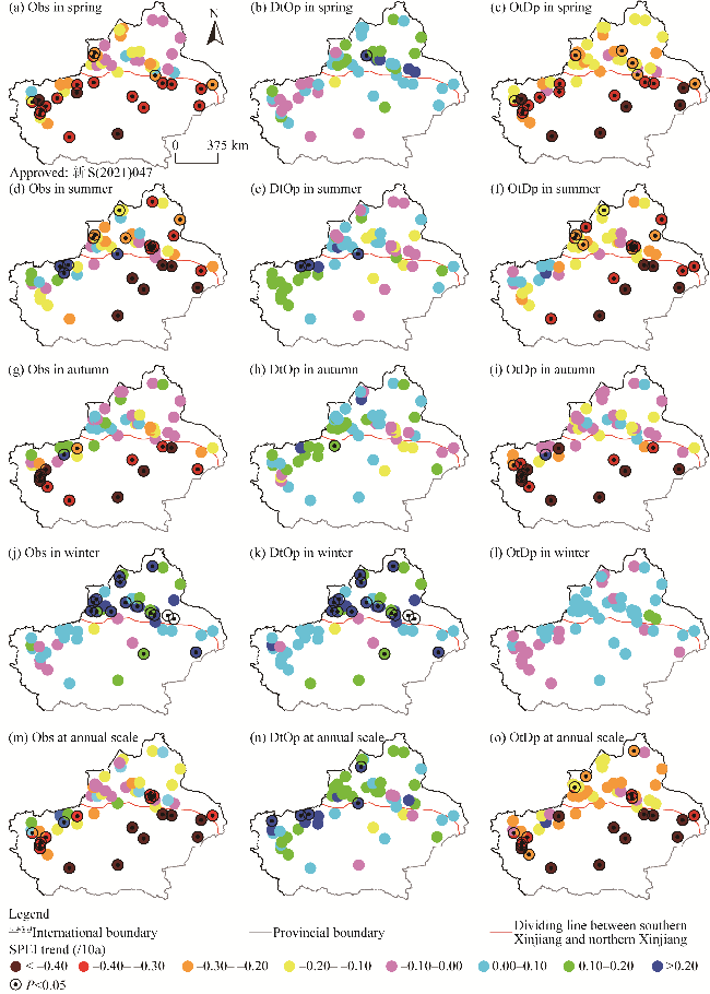 Fig. 6 Spatial distribution of drought trends in Xinjiang from 1980 to 2020 under the Obs (a, d, g, j, and m), DtOp (b, e, h, k, and n), and OtDp (c, f, i, l, and o) scenarios. Obs, observed temperature and precipitation; DtOp, detrended temperature and observed precipitation; OtDp, observed temperature and detrended precipitation. |