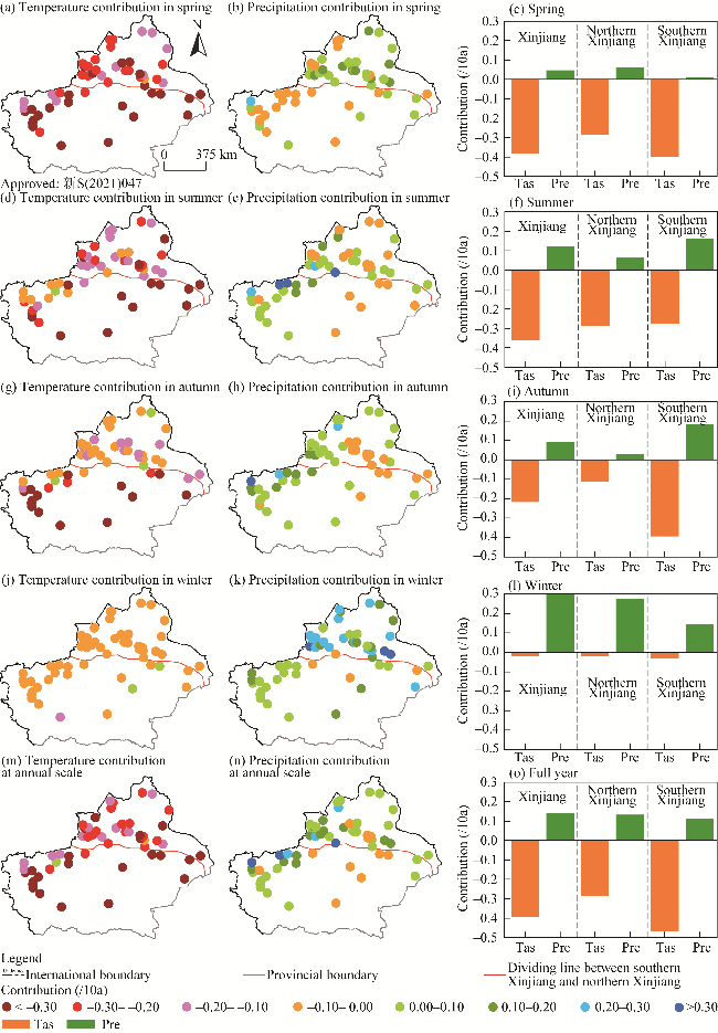 Fig. 7 Contribution of temperature and precipitation trends to drought trends at seasonal (a, b, c, d, e, f, h, i, j, k, and l) and annual (m, n, and o) scales in Xinjiang from 1980 to 2020. Tas, temperature; Pre, precipitation. |