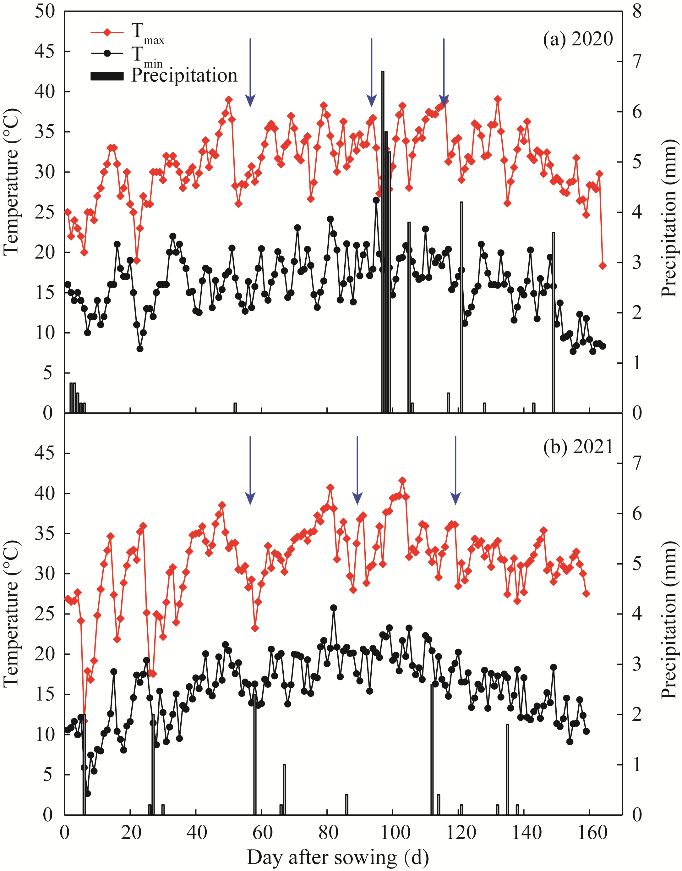 Fig. 1 Precipitation, maximum temperature (Tmax), and minimum temperature (Tmin) during the cotton growth period in 2020 (a) and 2021 (b). The blue arrow markings in the figure represent leaching date. |