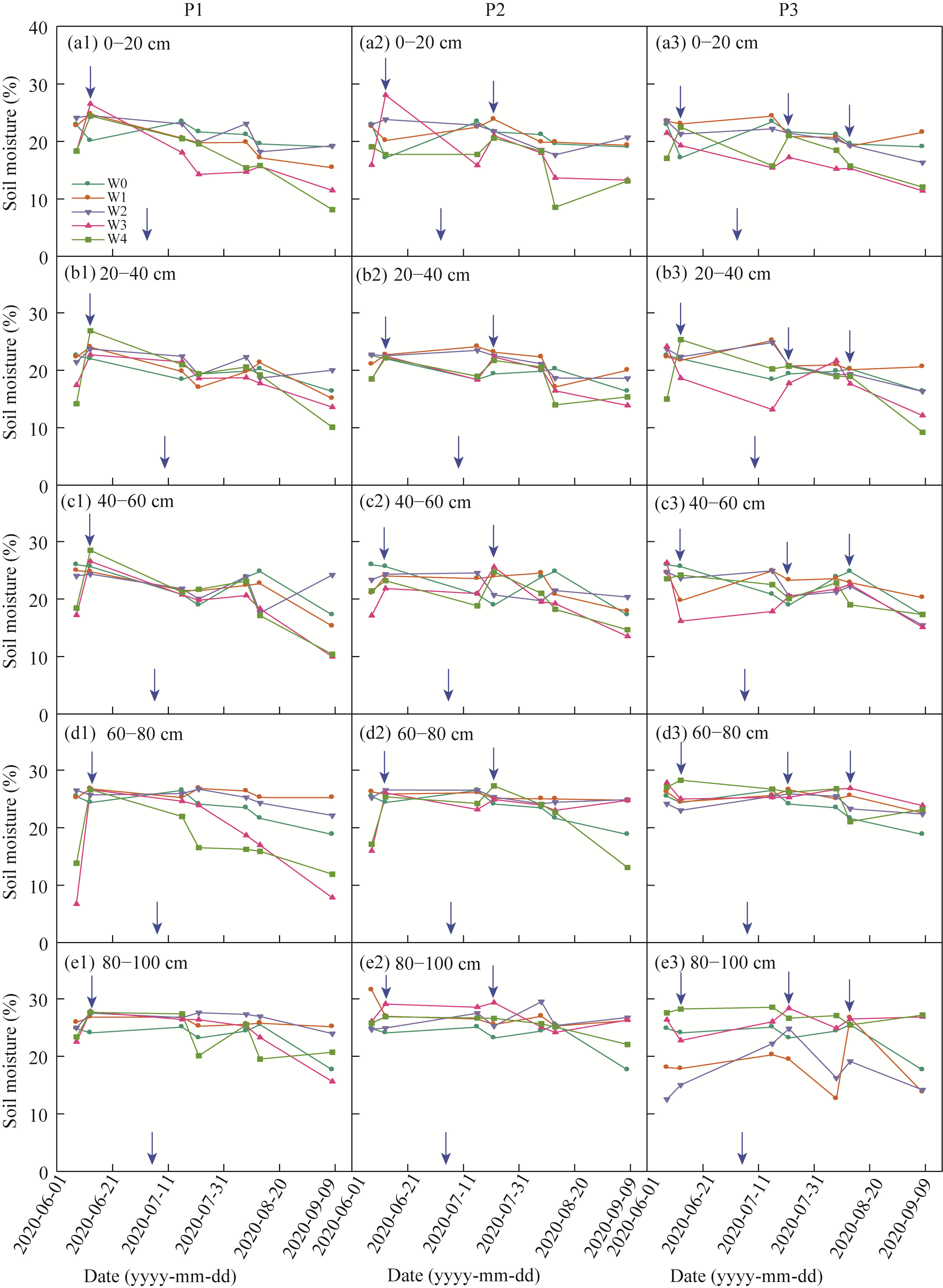 Fig. 3 Soil moisture dynamics for different leaching amount and period treatments in 2020. (a1-a3), 0-20 cm; (b1-b3), 20-40 cm; (c1-c3), 40-60 cm; (d1-d3), 60-80 cm; (e1-e3), 80-100 cm; W0, W1, W2, W3, and W4 represent leaching amount of 0.0, 75.0, 150.0, 225.0, and 300.0 mm, respectively. P1, seedling stage; P2, seedling and squaring stage; P3, seedling, squaring, and boll flowering stage. Arrow means the leaching date. The abbreviations of treatments are the same in the following figures and tables. |