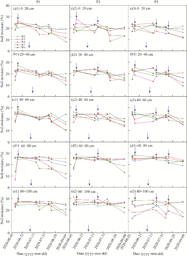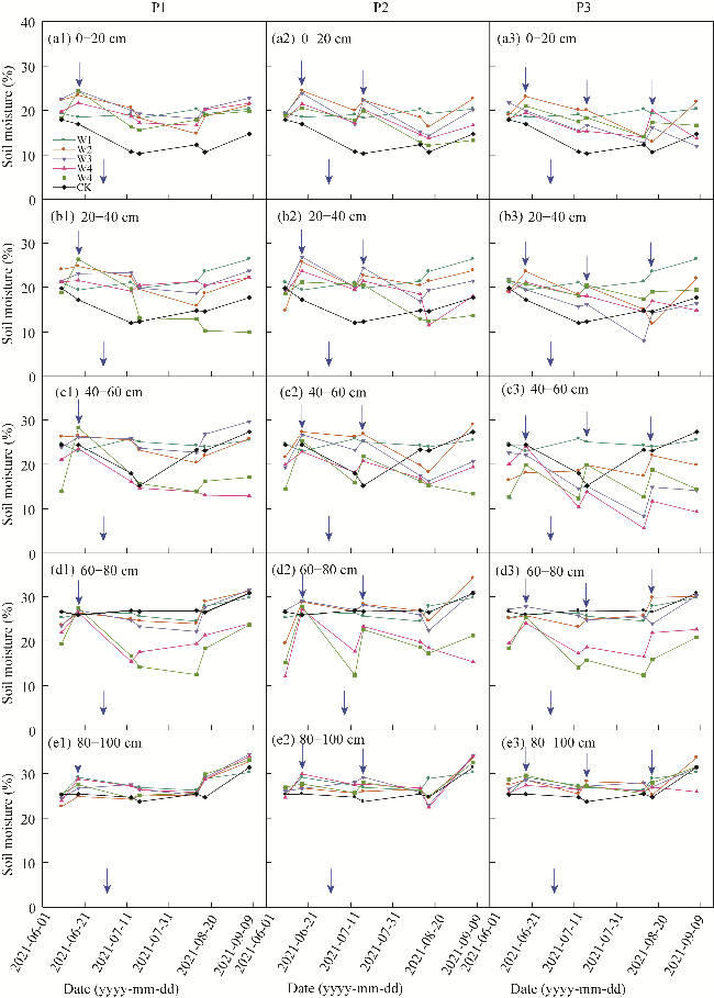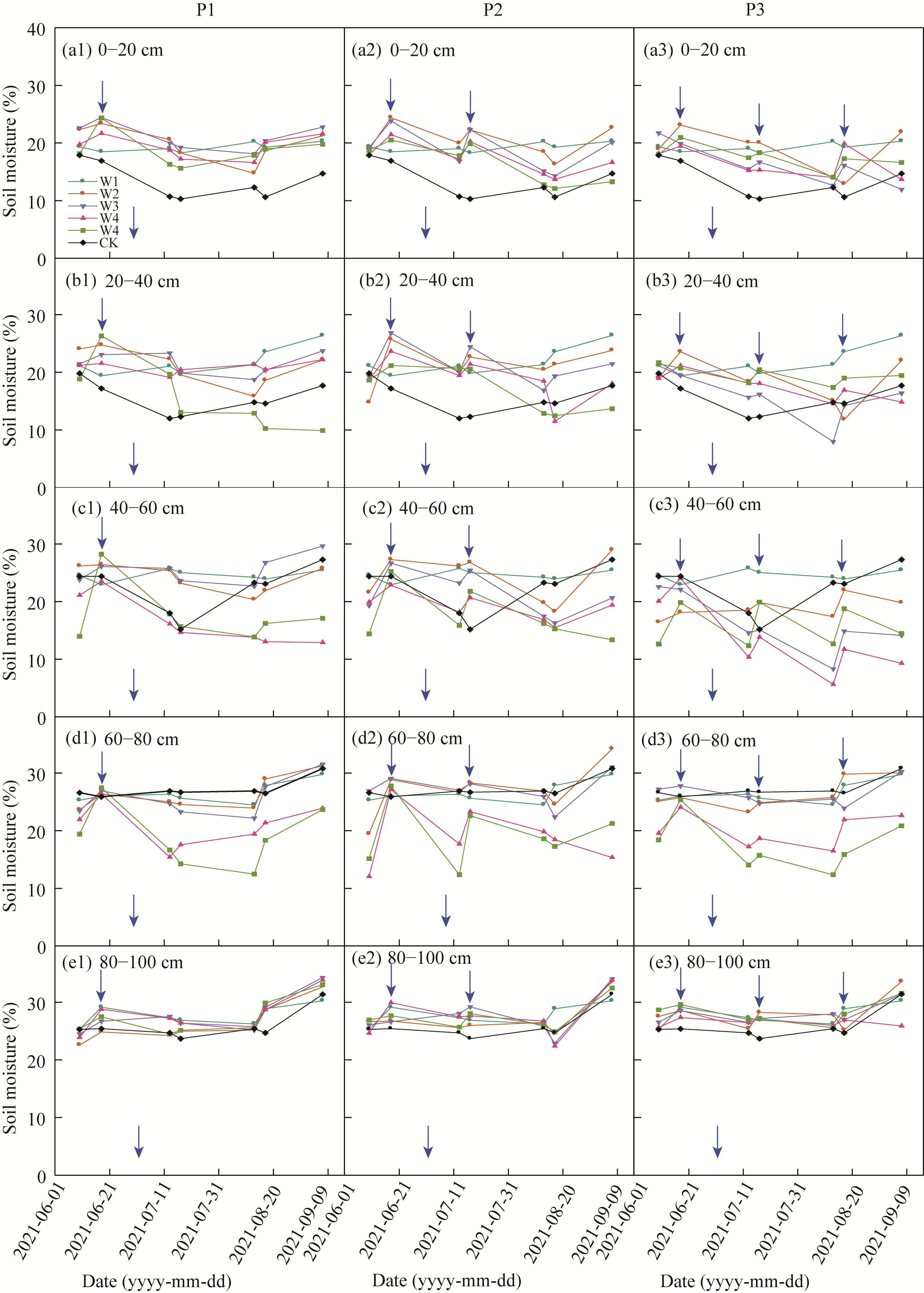 Fig. 4 Soil moisture dynamics for different leaching amount and period treatments in 2021. (a1-a3), 0-20 cm; (b1-b3), 20-40 cm; (c1-c3), 40-60 cm; (d1-d3), 60-80 cm; (e1-e3), 80-100 cm. Arrow means the leaching date. |