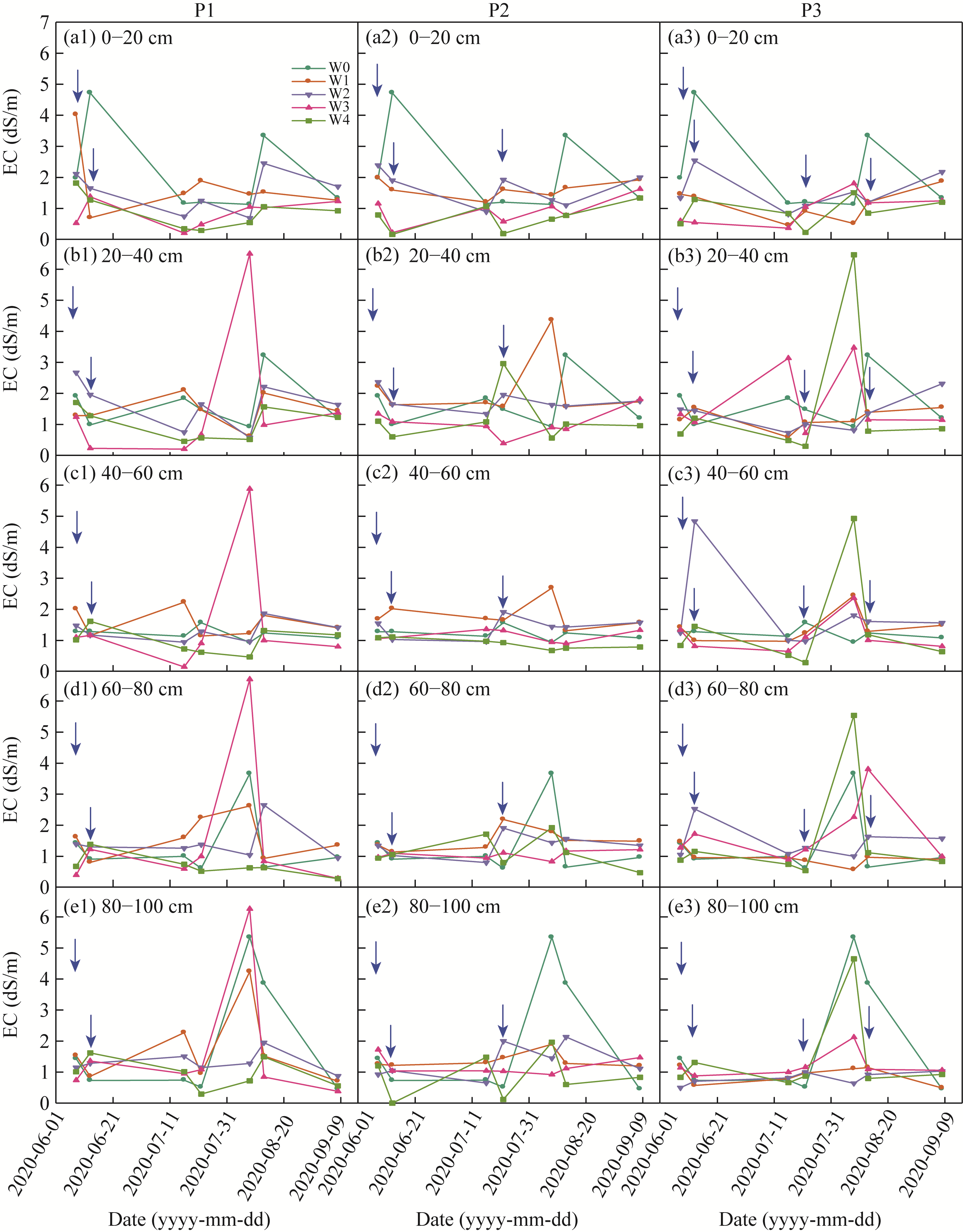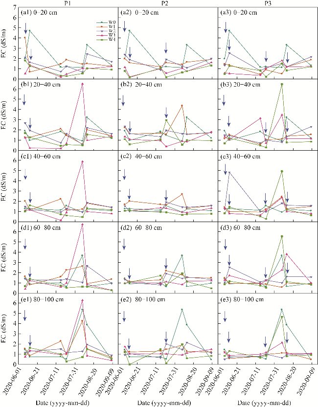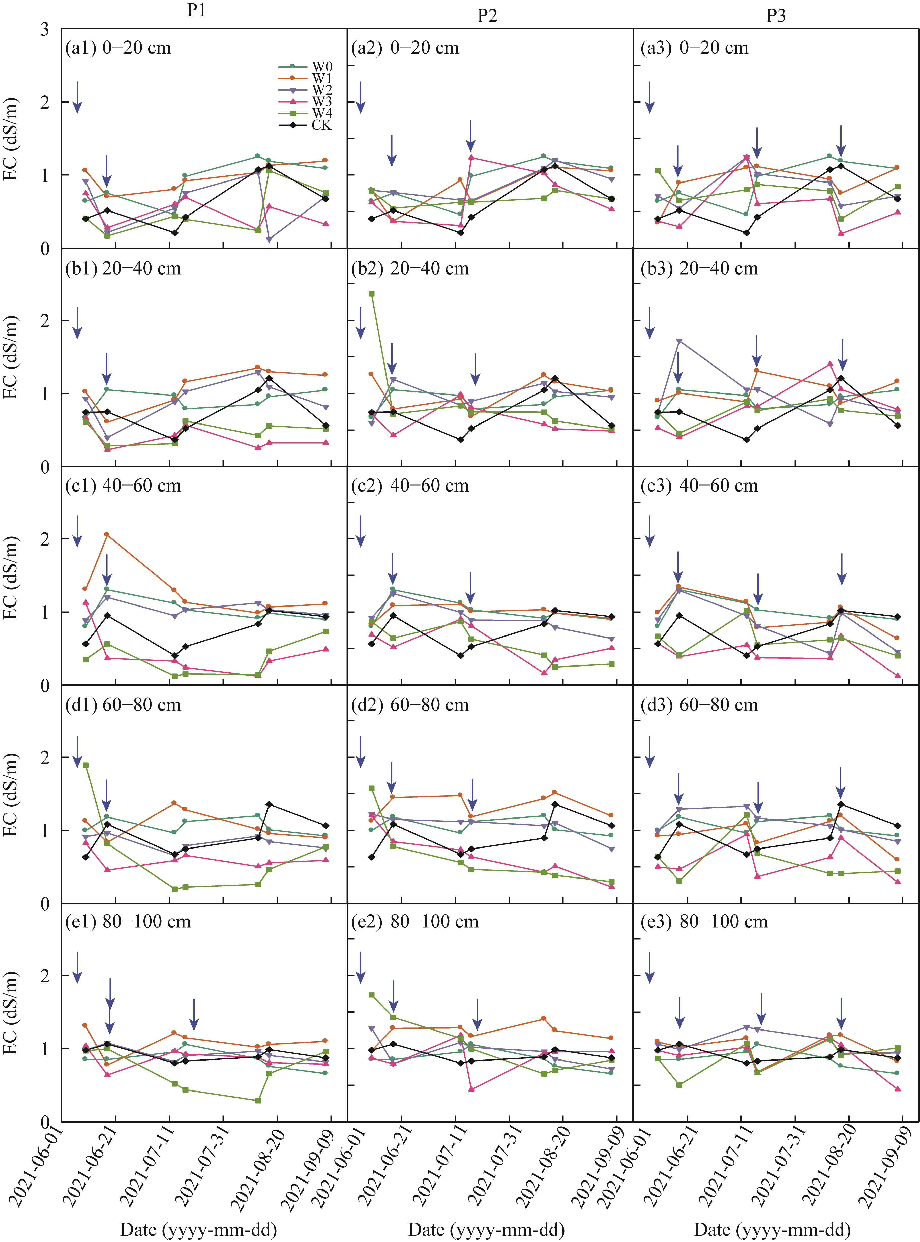 Fig. 5 Soil electrical conductivity (EC) dynamics for different leaching amount and period treatments in 2020. (a1-a3), 0-20 cm; (b1-b3), 20-40 cm; (c1-c3), 40-60 cm; (d1-d3), 60-80 cm; (e1-e3), 80-100 cm. Arrow means the leaching date. |