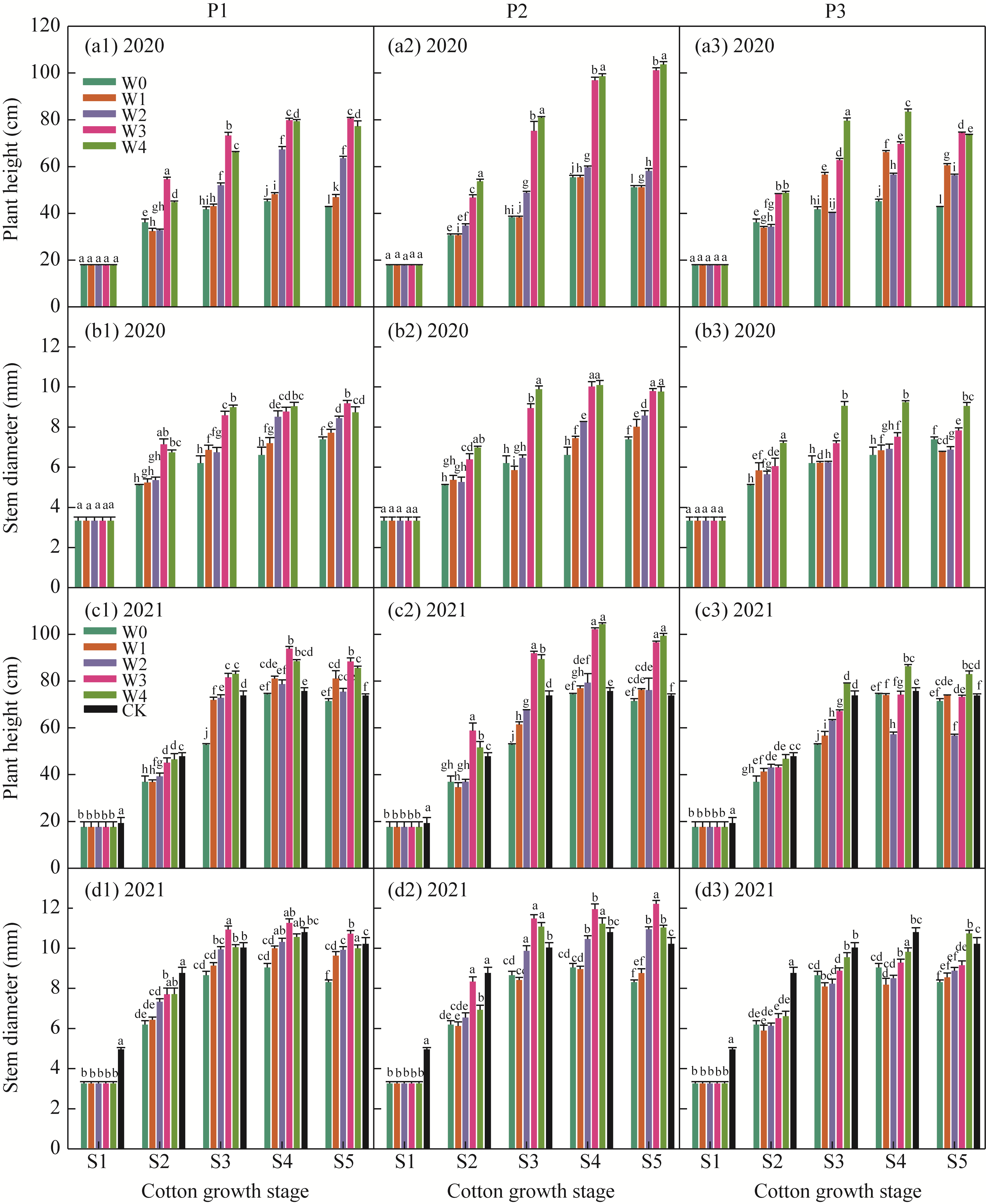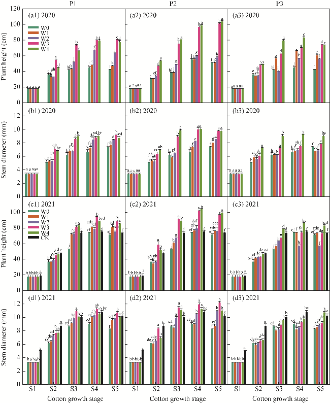 Fig. 7 Effects of different leaching amount and period treatments on plant height and stem diameter of cotton in 2020 and 2021. (a1-a3), plant height in 2020; (b1-b3), stem diameter in 2020; (c1-c3), plant height in 2021; (d1-d3), stem diameter in 2021. S1, S2, S3, S4, and S5 represent seedling, squaring, flowering, boll, and opening-boll stages of cotton, respectively. Different lowercase letters within the same stage indicate significant difference among different leaching amount treatments at P<0.05 level. Bars are standard errors. |