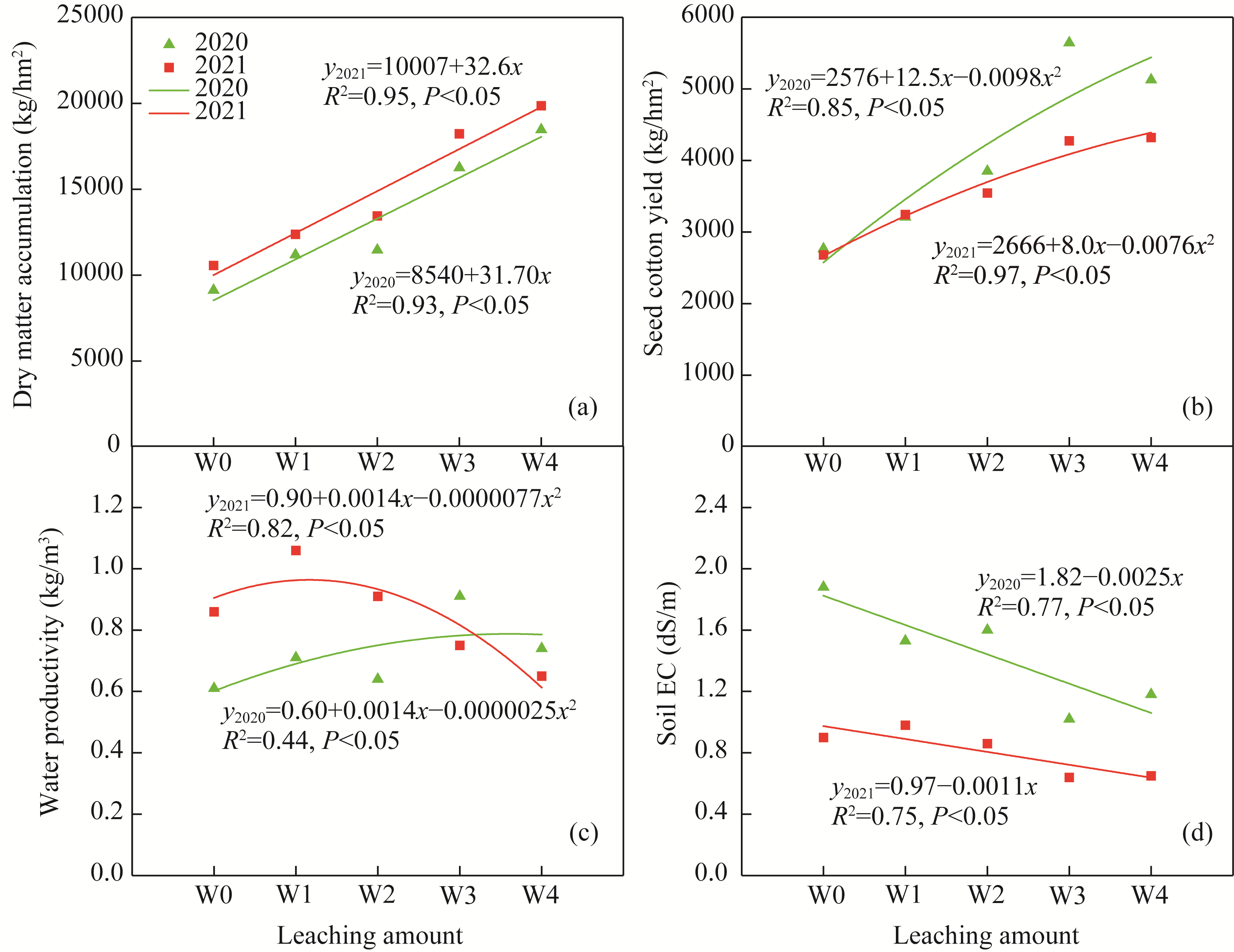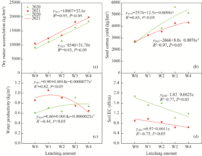Fig. 9 Relationships of dry matter accumulation (a), seed cotton yield (b), water productivity (c), and soil EC (d) with leaching amount in 2020 and 2021 |